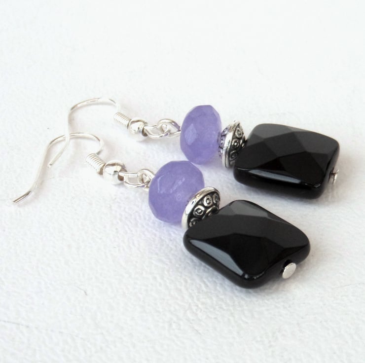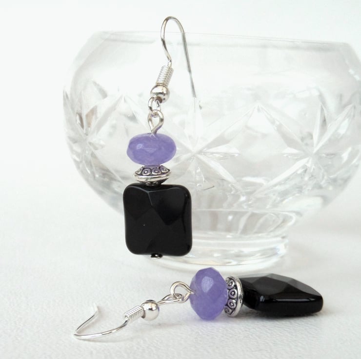 A pair of handmade earrings with faceted black onyx squares, tibetan silver rondelles and a purple jade rondelle.