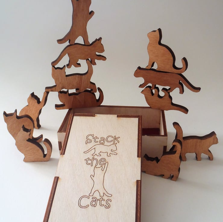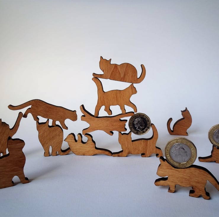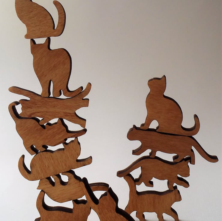A unique gift for cat lovers. Twelve wooden cats in different poses waiting to be stacked as high and creatively as possible.