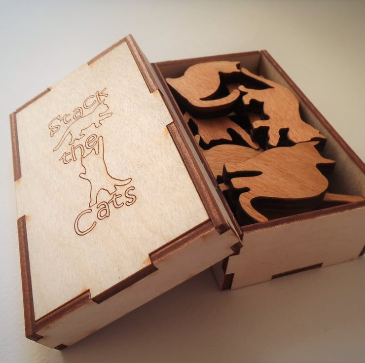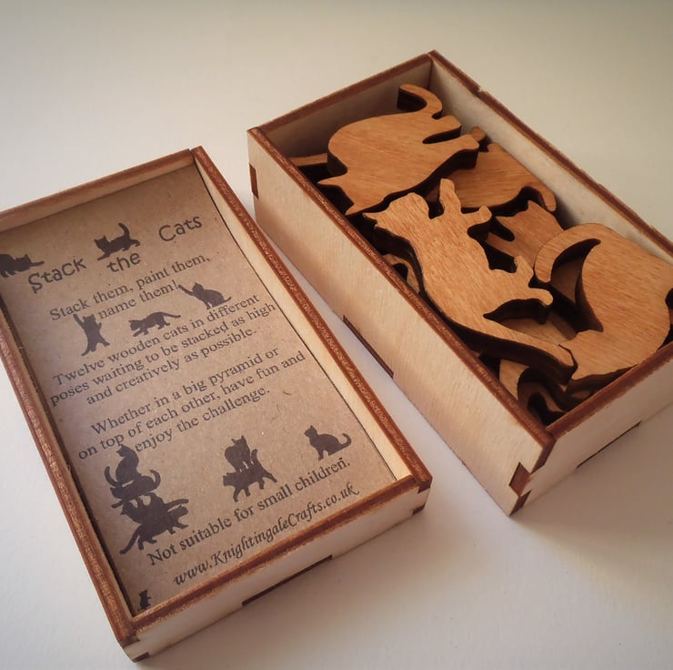 I also make the box that they come in, and this measures 11cm (4") x 6.5cm (2 1/2") x 3.5cm (1 1/2") (LxWxH). The cats and box are laser cut from FSC certified hardwood ply.