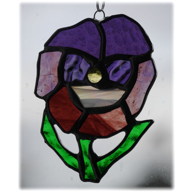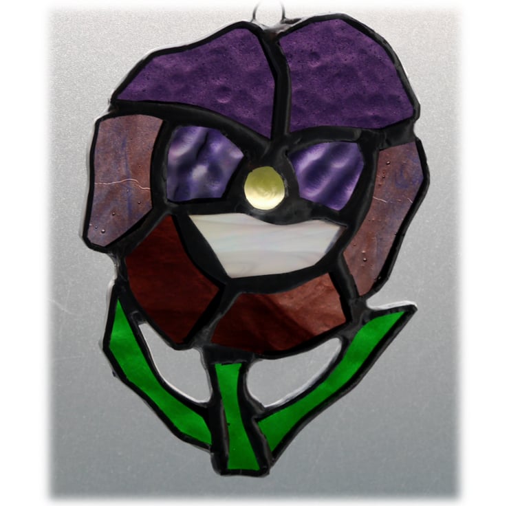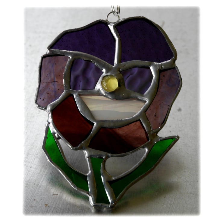 I've used streaky , iridescent and textured glass in different shades of purple to make it extra pretty and pansylike. The leaves are bright green and it has a little yellow glass nugget at the centre which I made in my kiln.