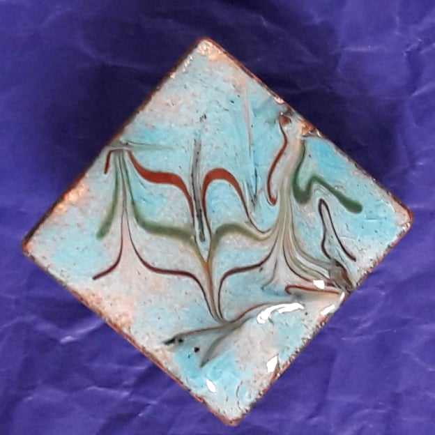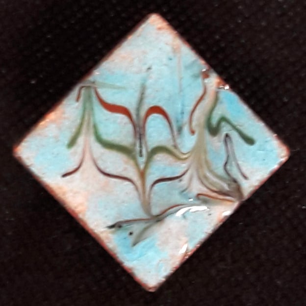 This brooch is 30mm square. It is mounted on a 26mm brooch bar that fastens with a rotating catch. The bar is soldered to the copper base.