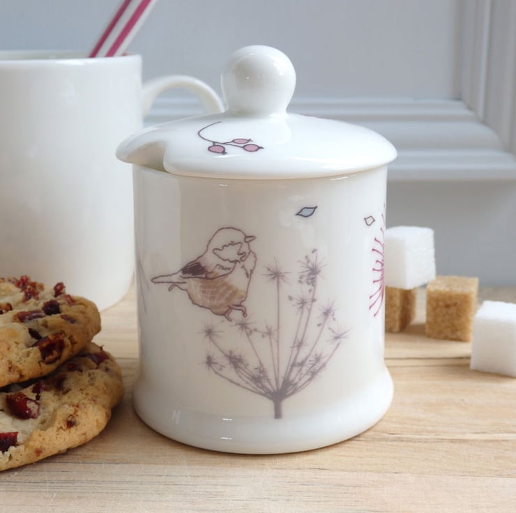 Hand decorated using digital transfers of my watercolour illustrations, each pot has a unique design reaching around the outside and lid. My illustrations are professionally printed onto ceramic transfers that can withstand being kiln fired to 800°C. Each bird, leaf, seedhead etc is printed individually for me to compose each design from the separate elements as I decorate the pot making each one special and unique.