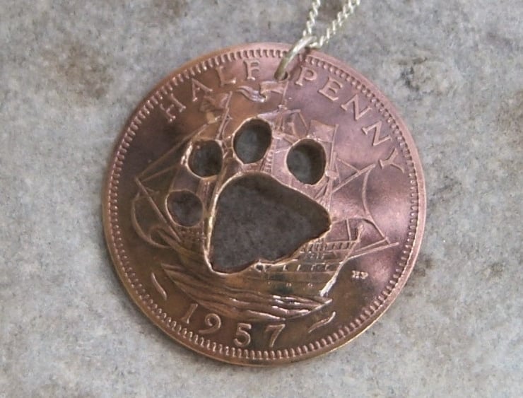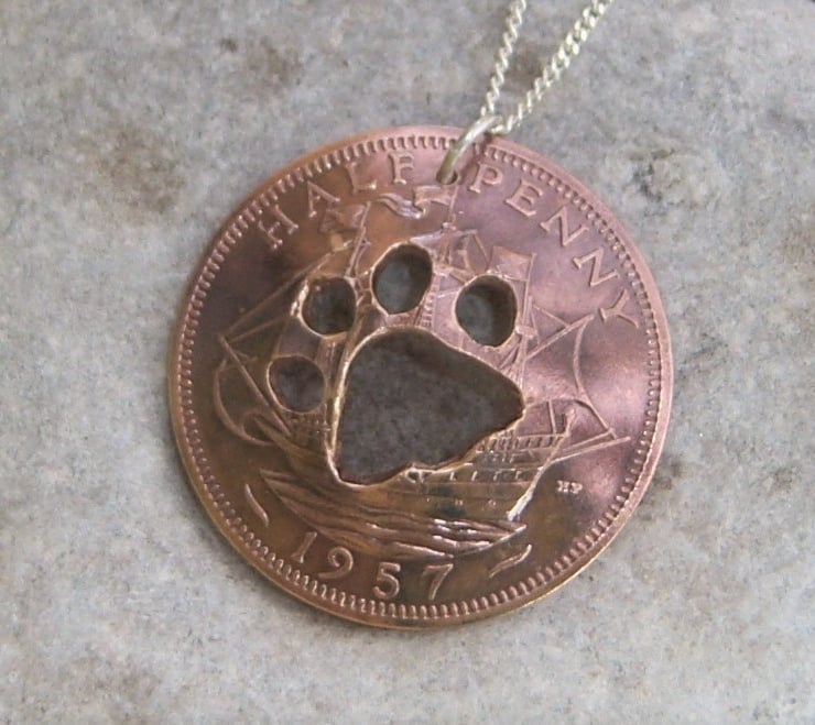 A paw has been cut out of a bronze halfpenny coin and then made into a domed shape. Approximately 2.5 cms across.