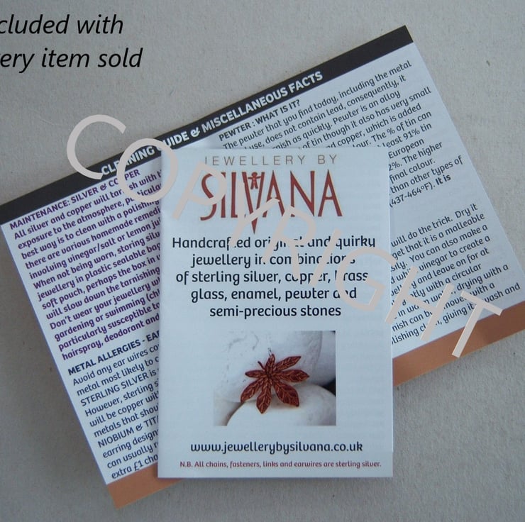 All my jewellery listed here is sterling silver except for the silver plated upcycled cutlery collection. There will be elements of sterling silver in every design (except keyrings and bookmarks), some will be completely so, others may have combinations of copper, brass, bronze, glass, enamel, pewter, resin, upcycled biscuit tins, cutlery and pre-decimal coins and/or gemstones as well. Many of the designs are one-of-a-kind.