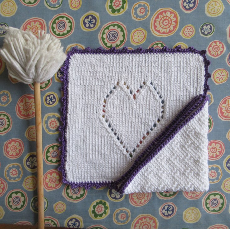A pair of white 100% soft cotton hand knitted dishcloths or face cloths. One cloth is knitted in smooth stocking stitch with an eyelet heart motif in the centre and bound in a crocheted picot edging, in green, navy blue, purple. The other cloth is knitted in a basket weave stitch and again bound in green, navy blue, purple crocheted edging. Perfect in the kitchen or bathroom, or indeed as a face cloth. Eco dishcloths as they can be washed on a 30' wash cycle and can be used repeatedly.