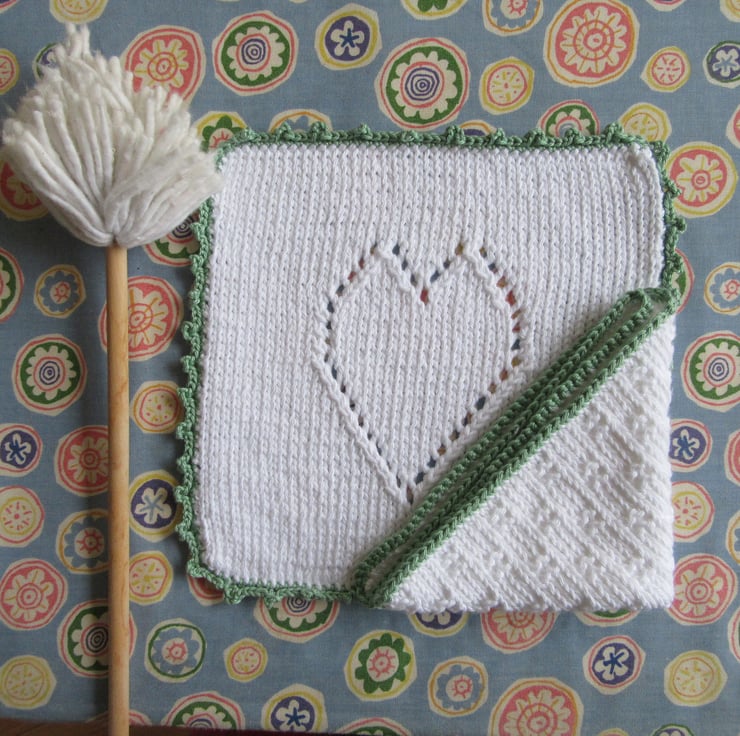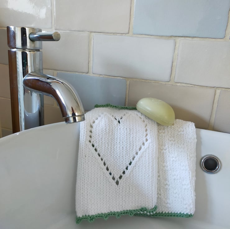 A pair of white 100% soft cotton hand knitted dishcloths or face cloths. One cloth is knitted in smooth stocking stitch with an eyelet heart motif in the centre and bound in a crocheted picot edging, in green or navy blue. The other cloth is knitted in a basket weave stitch and again bound in green, navy blue, purple crocheted edging. Perfect in the kitchen or bathroom, or indeed as a face cloth. Eco dishcloths as they can be washed on a 30' wash cycle and can be used repeatedly.