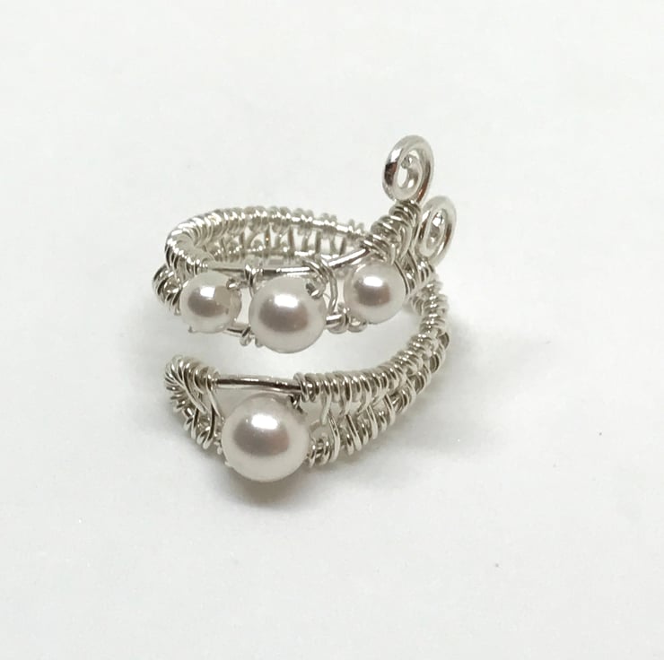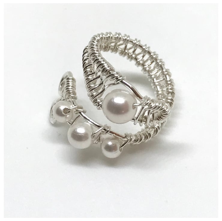 A unique sterling silver wire weave adjustable ring with pearls from Swarovski®.