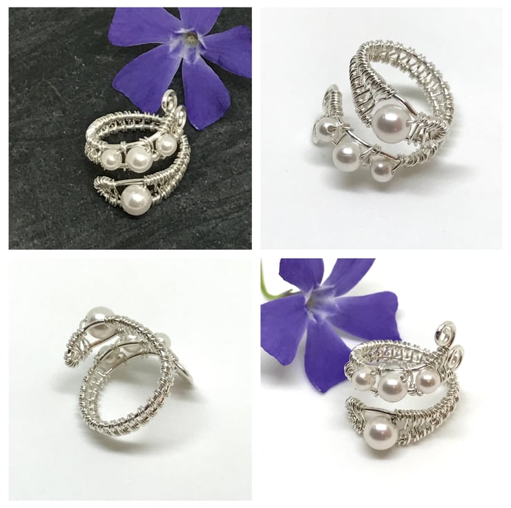 I have created this ring by weaving sterling silver wire between a sterling silver frame and I have added beautiful white pearls from Swarovski®. The frame of the ring is shaped around a ring mandrel and gentlyhammered to work harden the wire. The end of the ring is finished with 2 swirls.