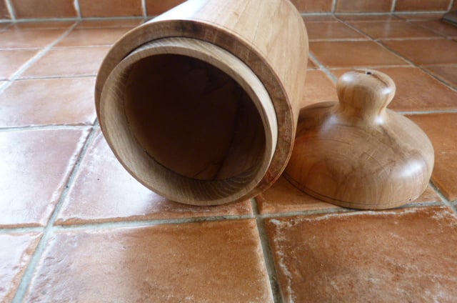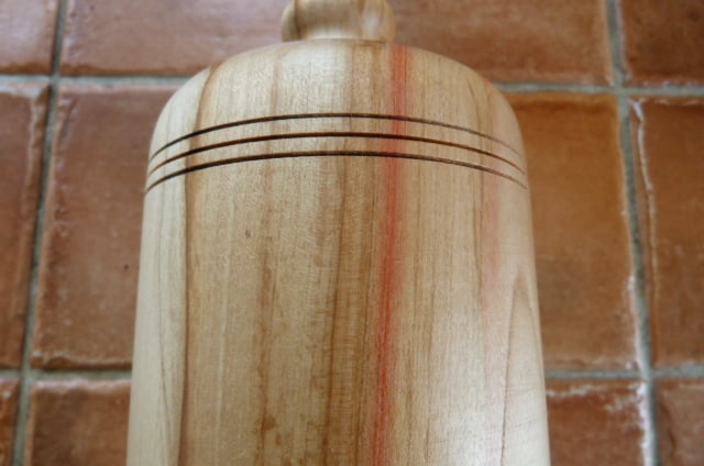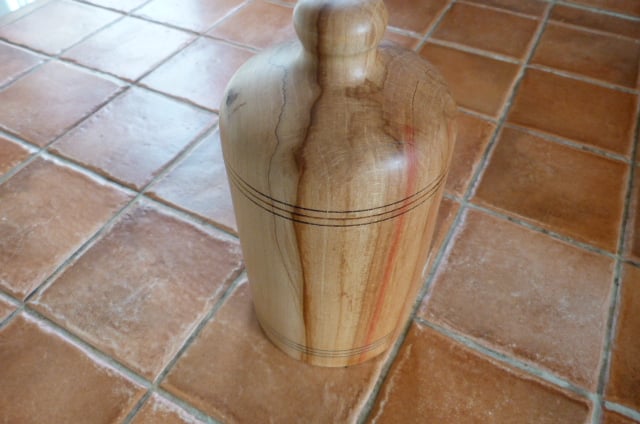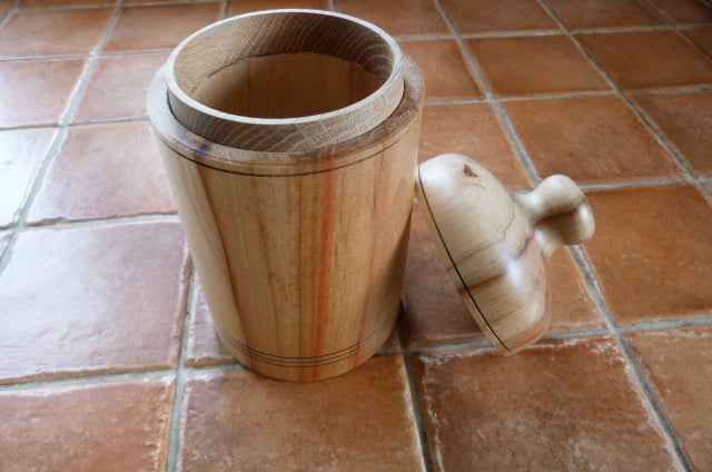 A LATHE TURNED STORAGE CONTAINER FOR USE ALL AROUND THE HOME, NOT NECESSARILY THE KITCHEN. THIS ONE STANDS 6 3/4 INCHES HIGH AND 3 1/4 INCHES IN DIAMETER.