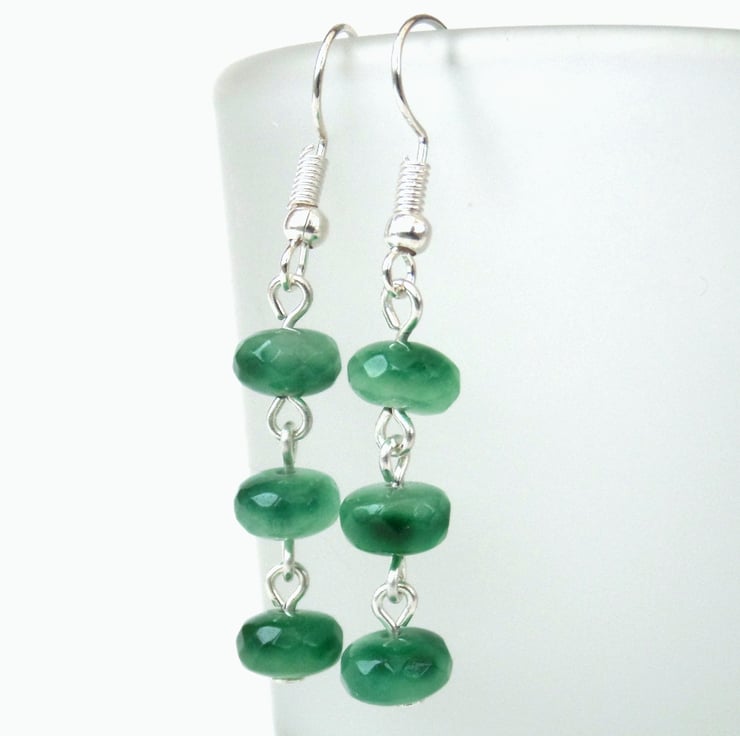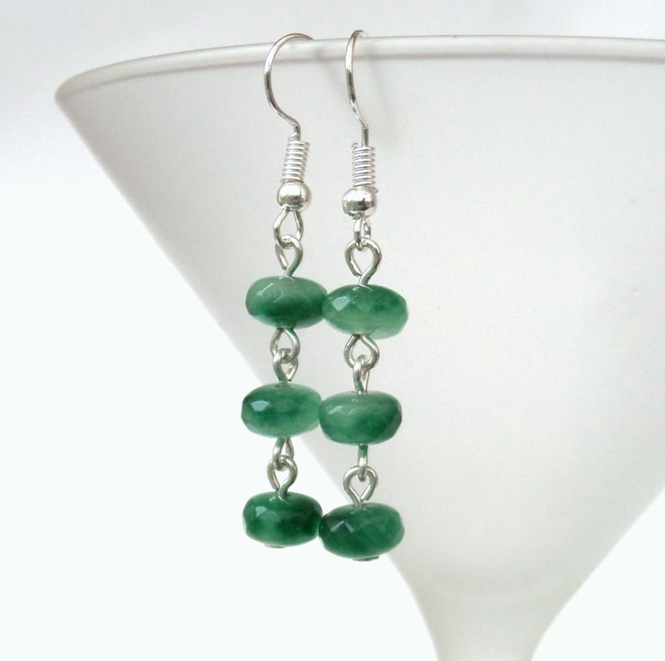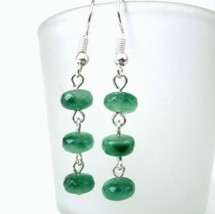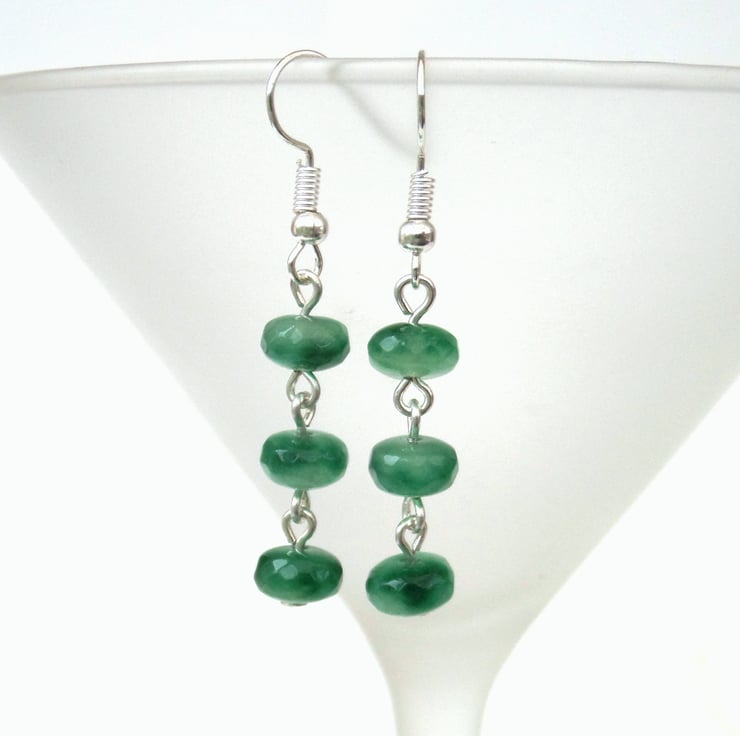 A trio of mottled green agate rondelles hang from silver plated earwires to create these earrings.