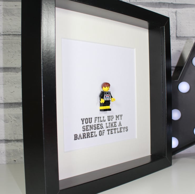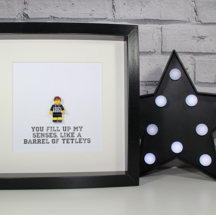 Our latest offering comes in the form of our tribute to Grimsby Town FC. We've had people ask for this and we thought it would be rude not to make it! We have created a custom minifigure using original Lego parts. Our little fella is wearing the latest strip that has been recreated using a customised sticker front on his torso. He has been mounted in to a deep box frame and we have printed "You fill up my senses, like a barrel of Tetleys" underneath.