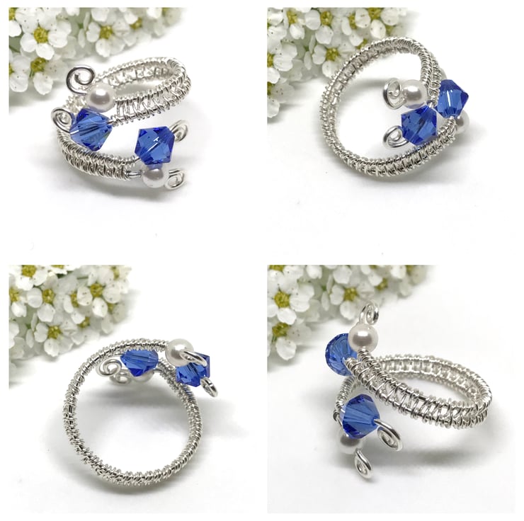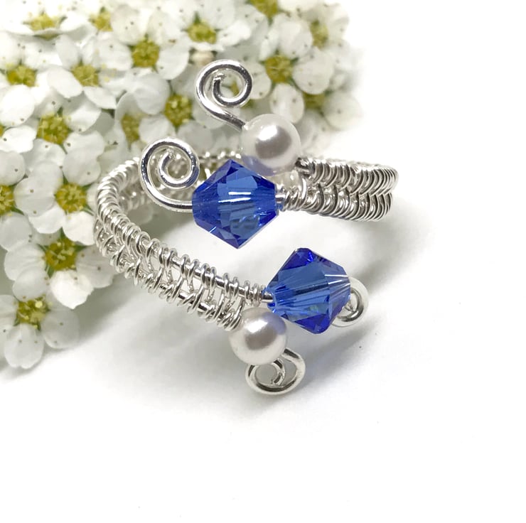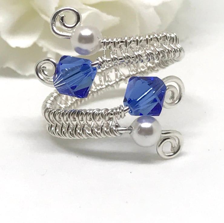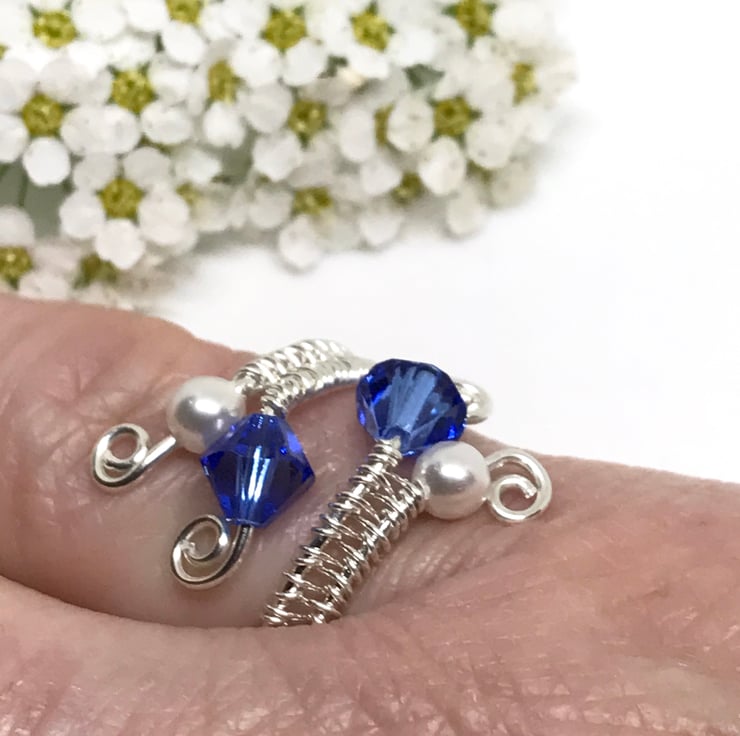 I have created this ring by weaving sterling silver wire around a silver frame. This is shaped around a ring mandrel, I have added beautiful white glass pearls and sparkling blue crystals and finished with swirls. The ring is gently hammered to work harden the silver.