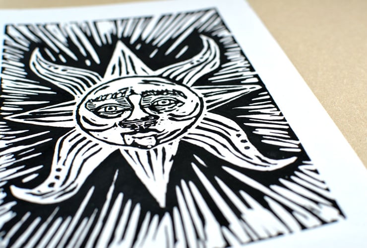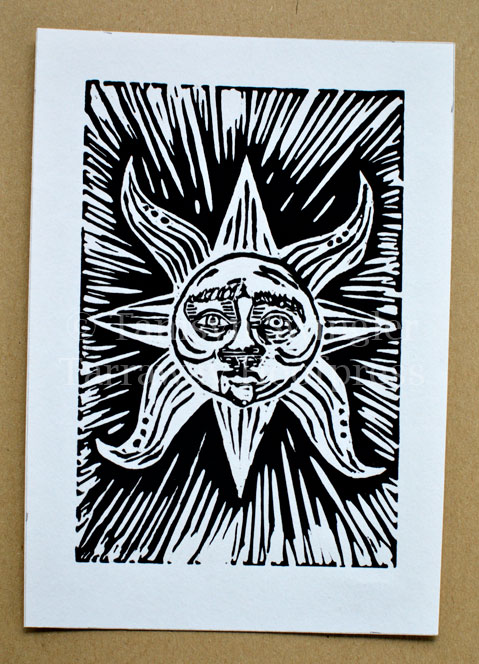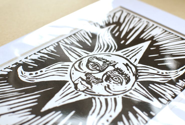 Water-based black, matte ink print on white 140gsm paper, hand-hand pressed with a spoon and touched up by hand also to give it a consistent tone all over.