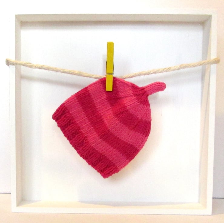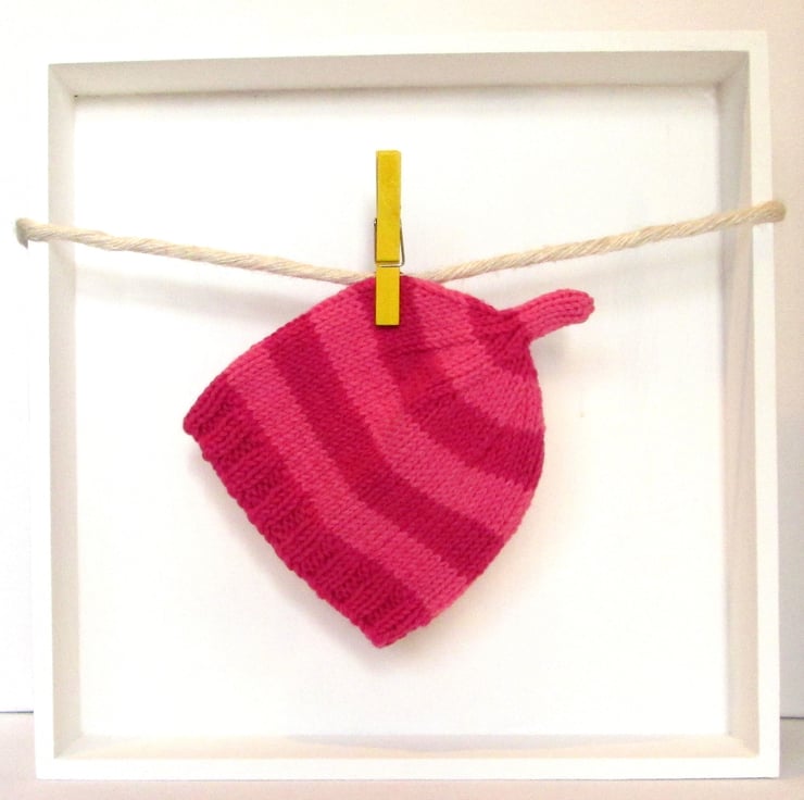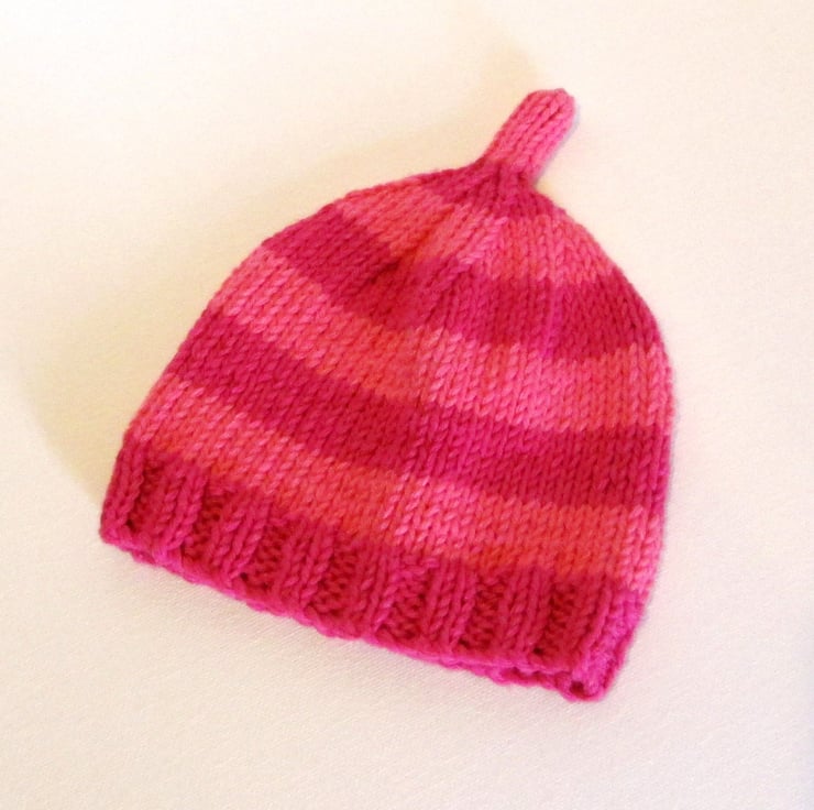 This stripy Dark Pink and Rose Pink baby beanie hat is hand knitted in a soft 100 per cent pure cotton, it has a decorative stalk on the top and a ribbed brim and is for an age 0 to 2 month baby.