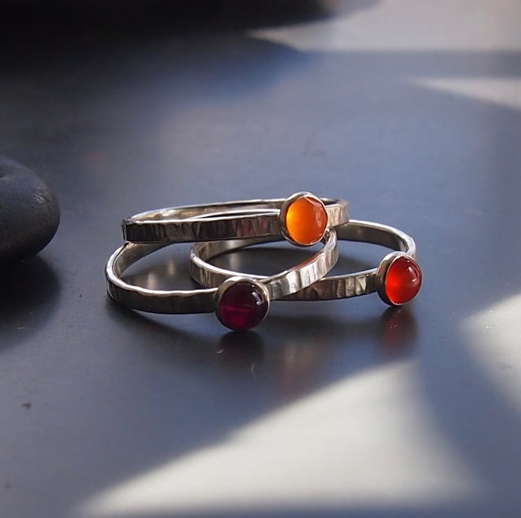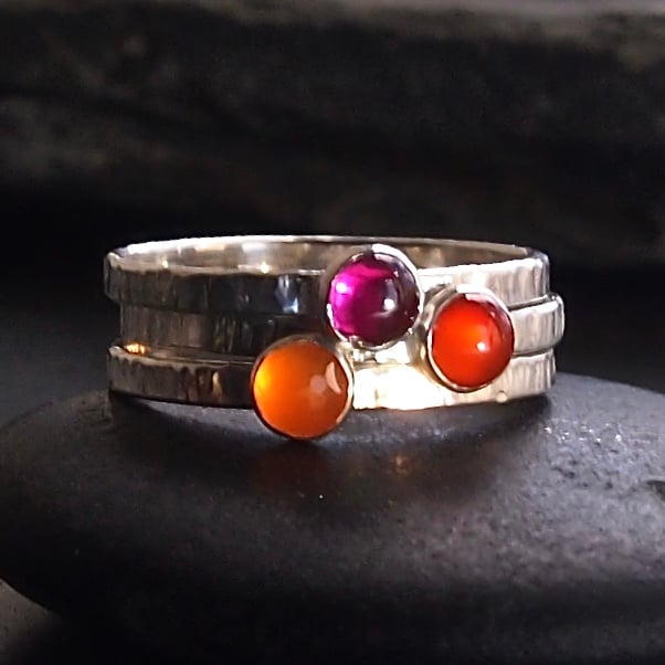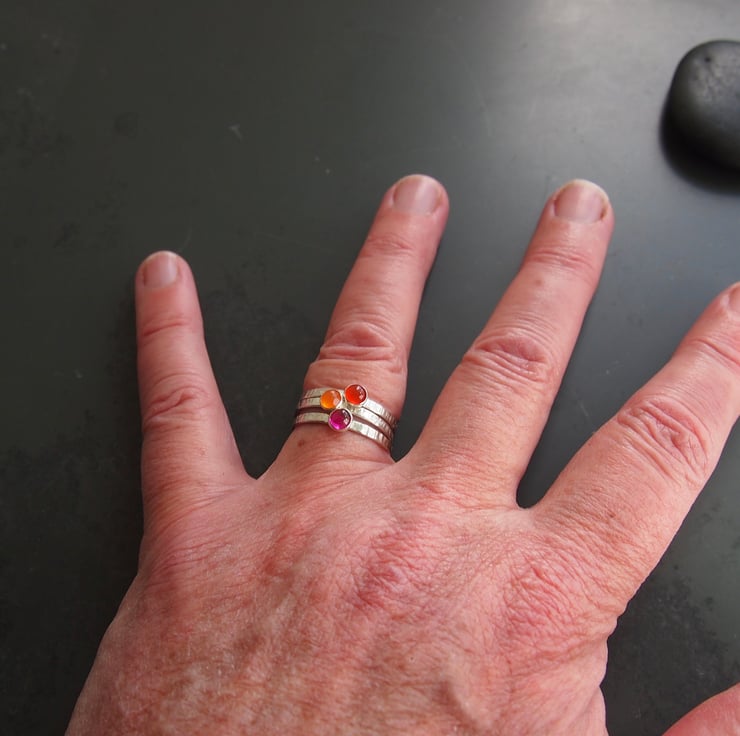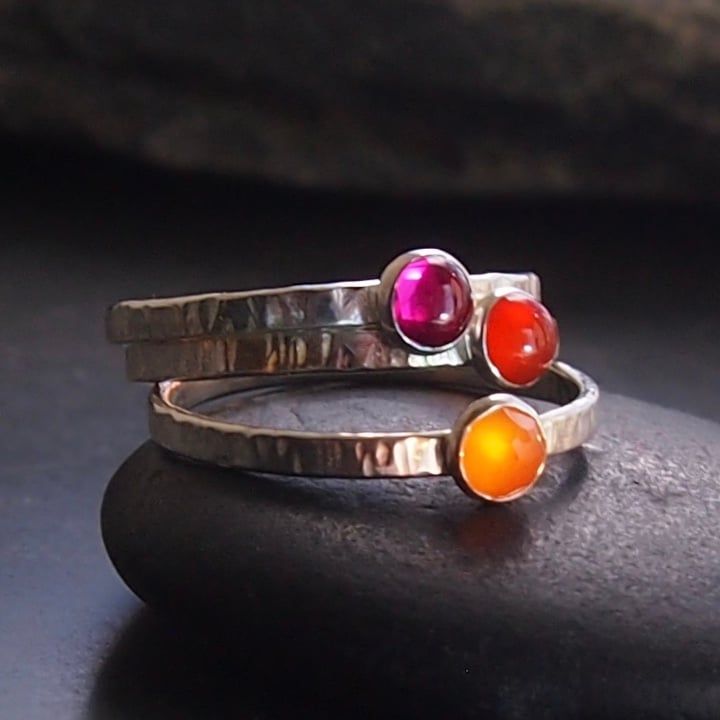 Three textured sterling silver rings stack together in this vibrant trio. Here we have one laboratory created ruby partnered with a deep tawny smooth carnelian and a facetted carnelian which is more golden. All the cabochons are 4mm and the sterling silver bands are 2mm.