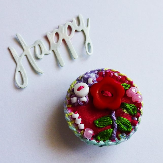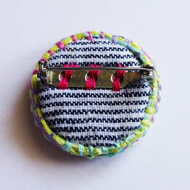 It is handmade with up-cycled cotton fabric, embellished with bright contrasting embroidery stitched detail, buttons and beads and is finished off on the reverse with a silver toned safety catch brooch back on a navy and white striped fabric.
