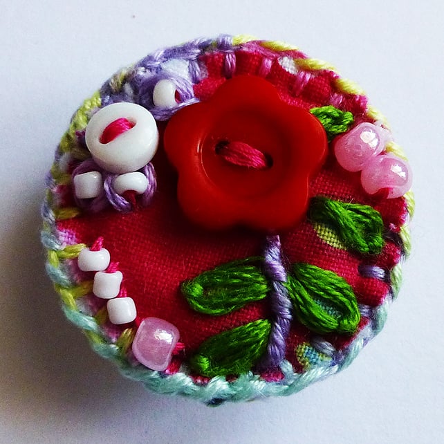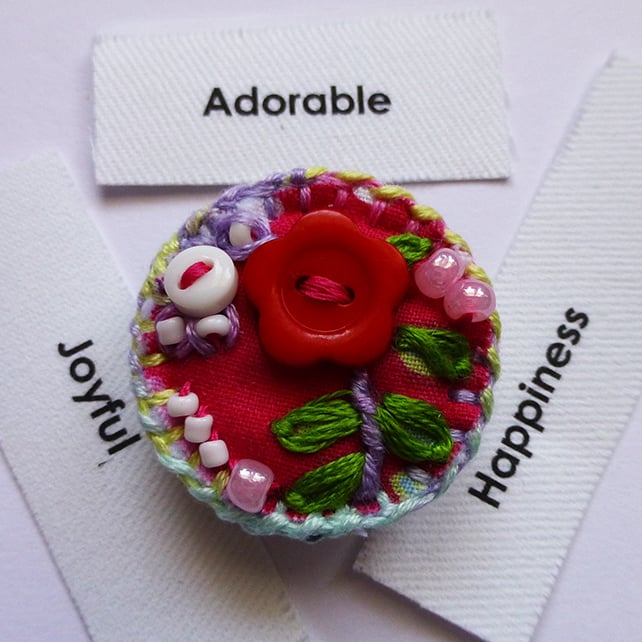 This colourful mini brooch pin features a red button flower and is just perfect for adding a little splash of colour to a jumper, cardigan or jacket.