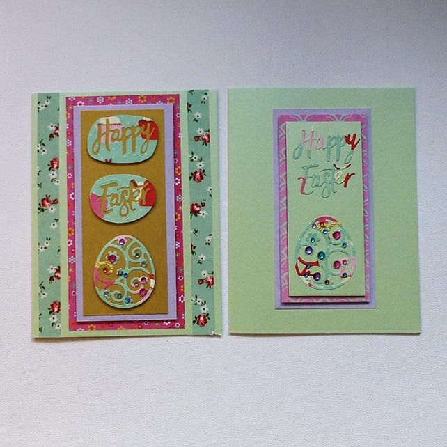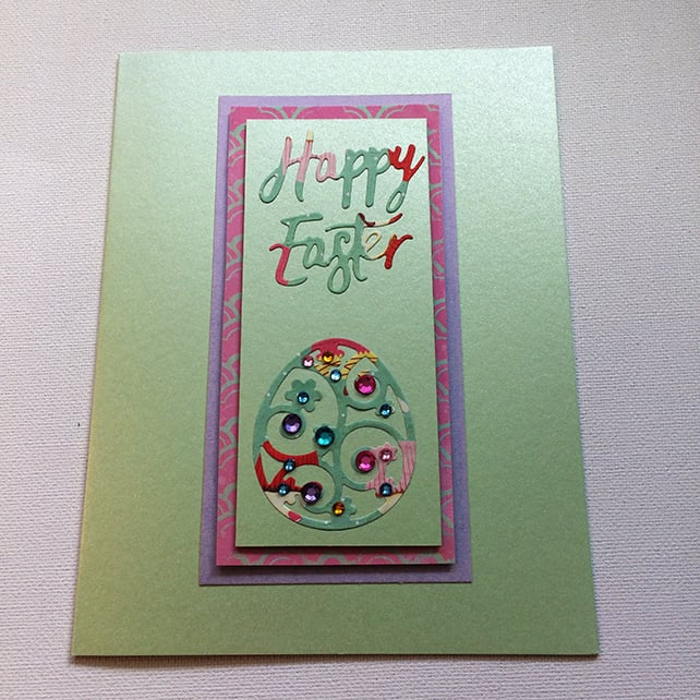 This handcrafted card has been decorated with a die-cut ‘Happy Easter’ greeting and Easter egg decoration, on green card with green and pink coloured patterned paper on a lilac shiny card, all finished off with little sparkly multi coloured self-adhesive gems.