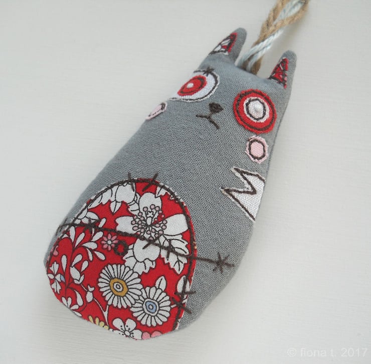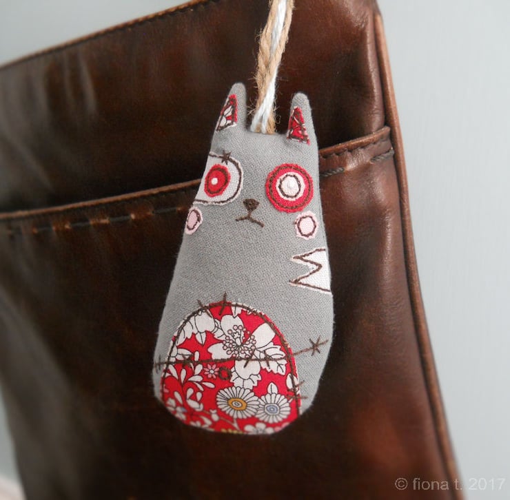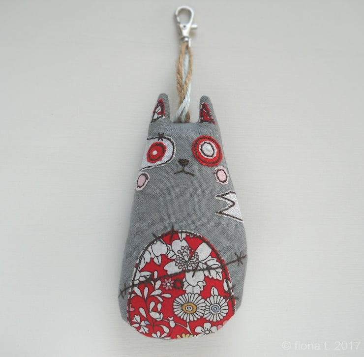 freehand embroidered zombie kitten bag charm or keyring - red.