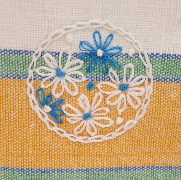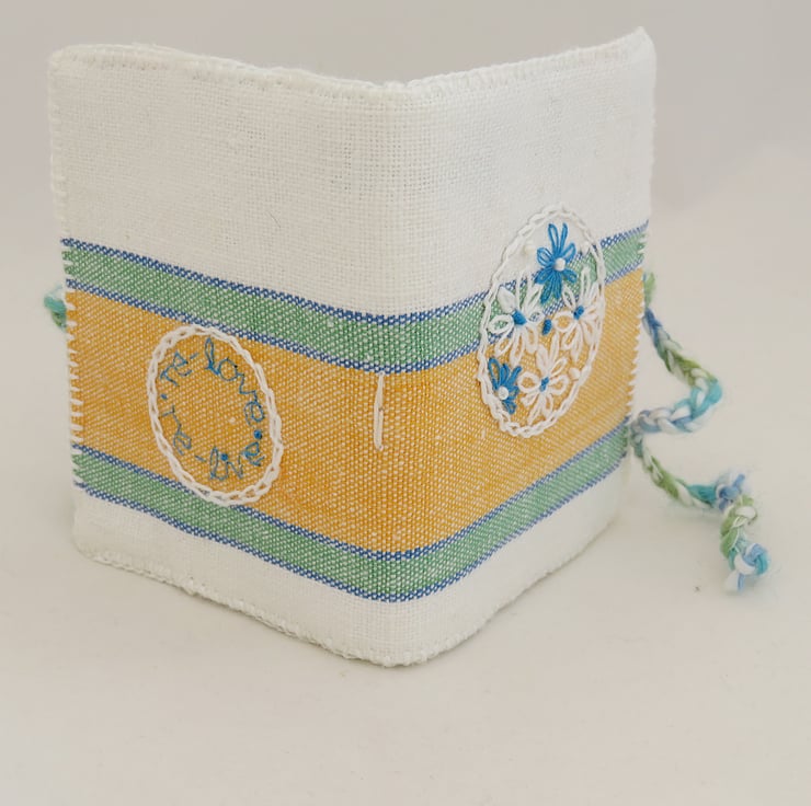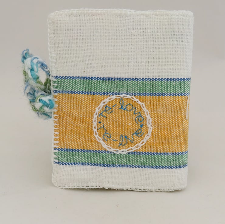 I loved the texture and bold stripes of a vintage, green and yellow tea towel which showed no signs of use. Cut so that the stripes are pleasingly placed, it has provided fabric for the cover of this needle book. A simple circular motif has been hand-embroidered onto the front of the cover using matching white and blue threads. On the reverse of the needlebook the sentiment 're-love re-live' has been hand embroidered in a circular motif in the same blue and white threads. The cover is finished by an edging of blanket stitch in white thread.