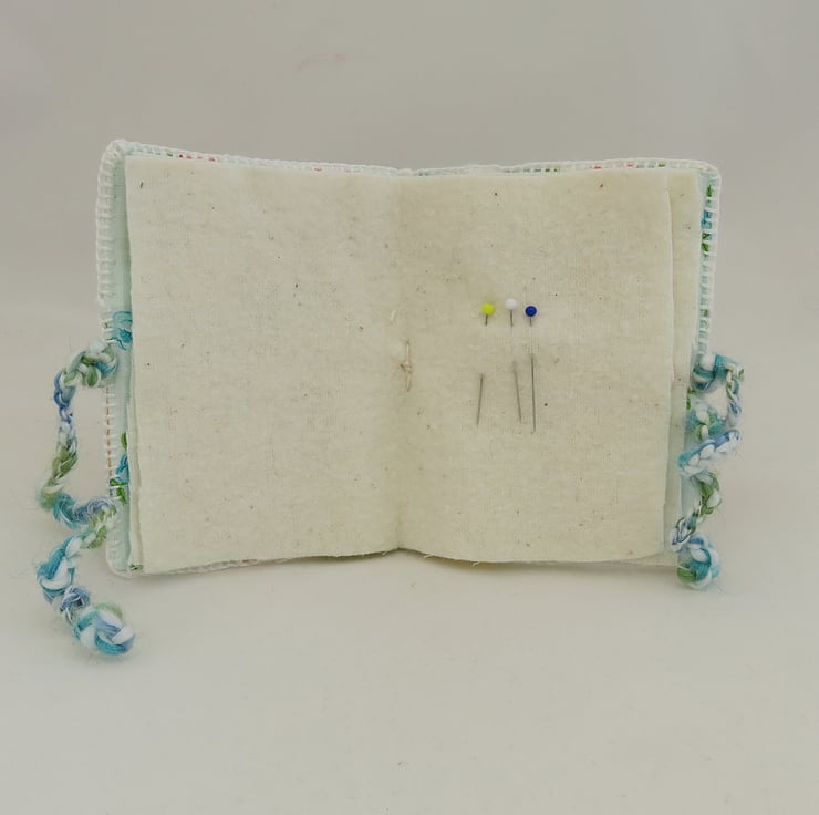The needle book is lined in an aqua and white striped fabric. The cover is stiffened by a layer of interfacing. Two pieces of vintage soft flannelette are folded and securely stitched in place, to provide four 'pages' for your needles and pins. The needle case closes by tying cords, crocheted from fancy yarn in coordinating colours.