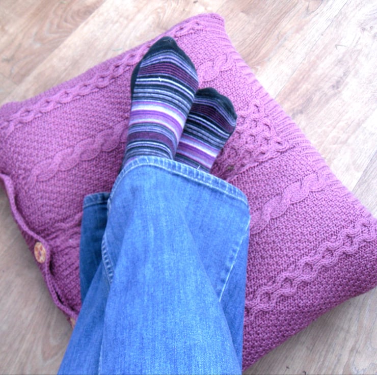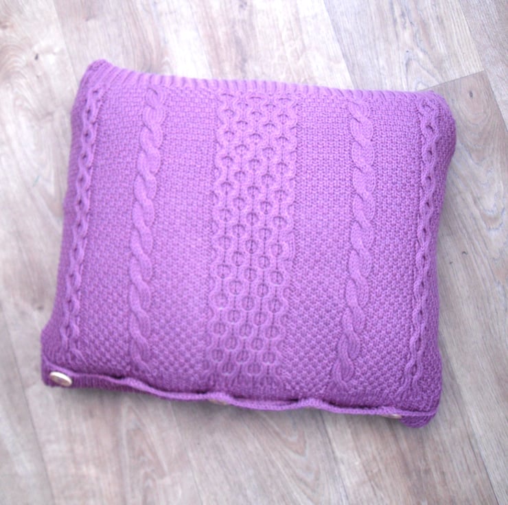 A unique original intricate and delicate knitted cable cushion cover. Knitted in a raspberry pink acrylic yarn, fastened with 5 pretty flowery wooden buttons. The cover measures 22" x 18" which is larger than the standard size.