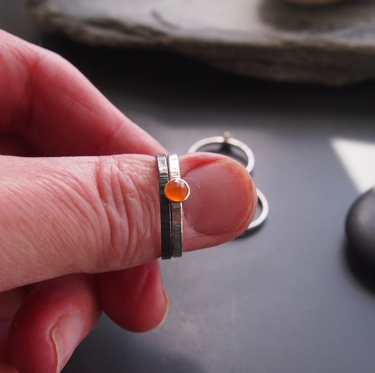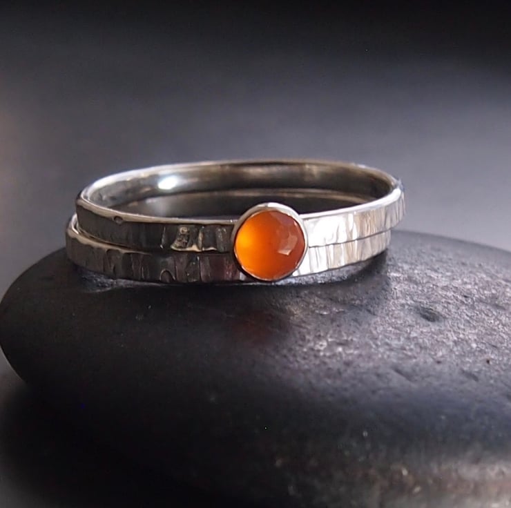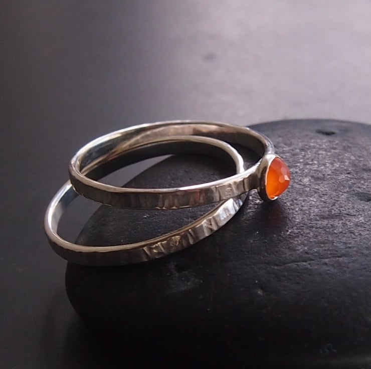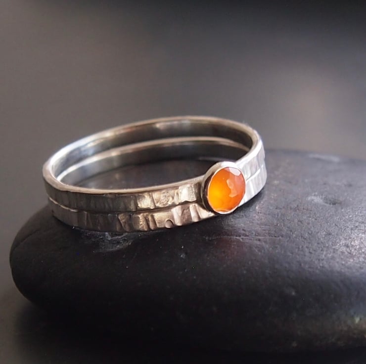 A sunny 4mm facetted yellow -orange carnelian is mounted on a 2mm textured band and paired with a plain textured band.