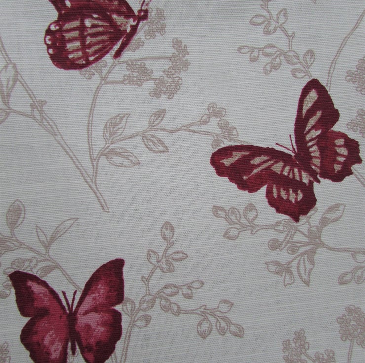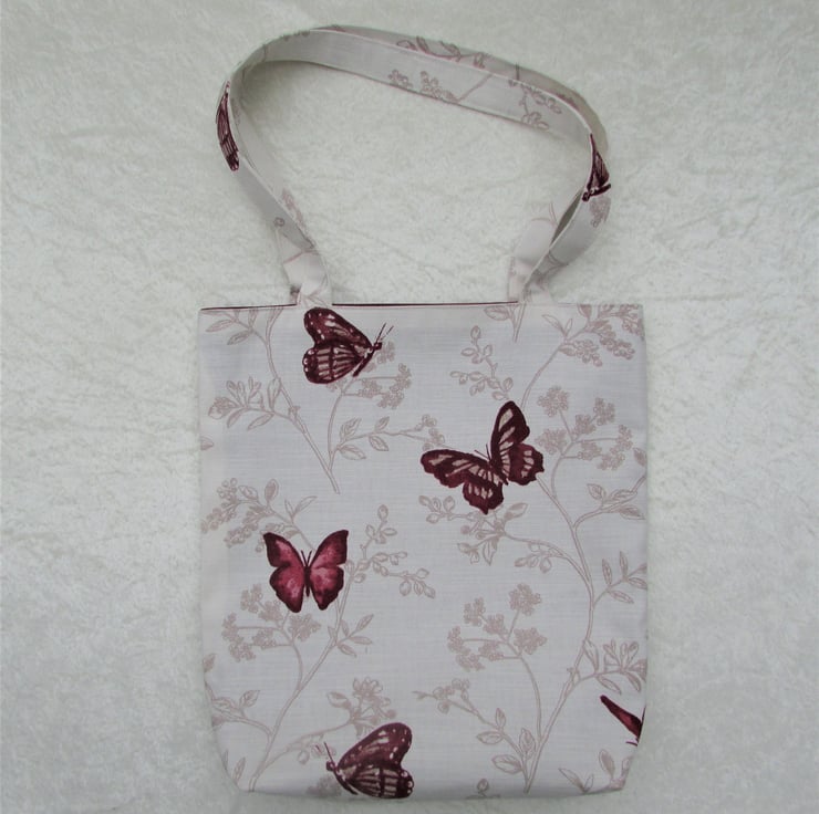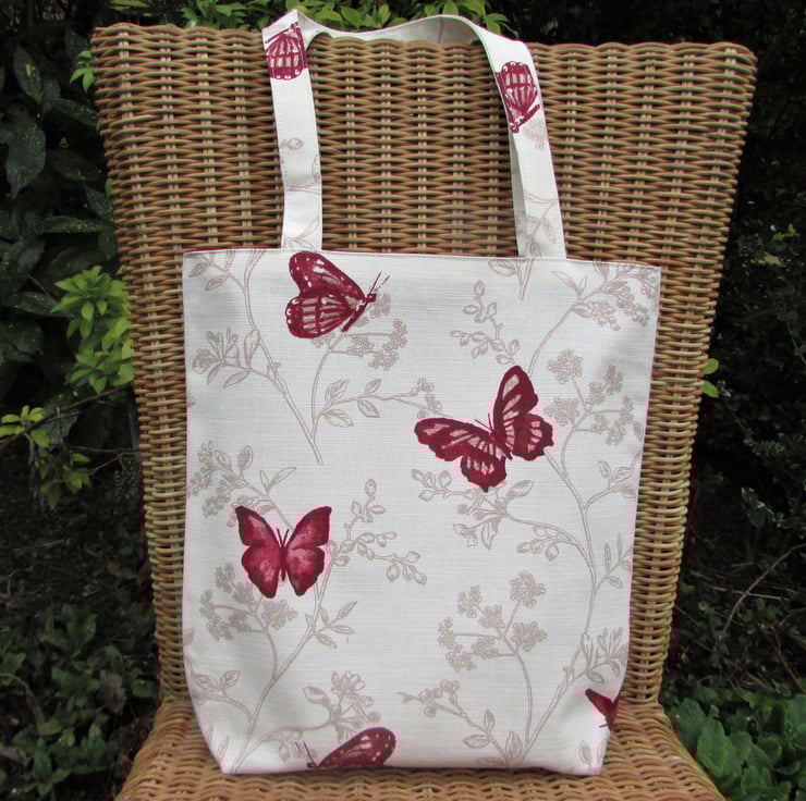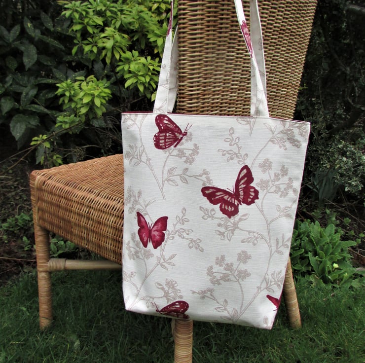A tote bag in a pretty fabric featuring a print pattern of beautiful red butterflies and delicate beige flowers on a cream background. The bag is fully lined with a co-ordinating red fabric.
