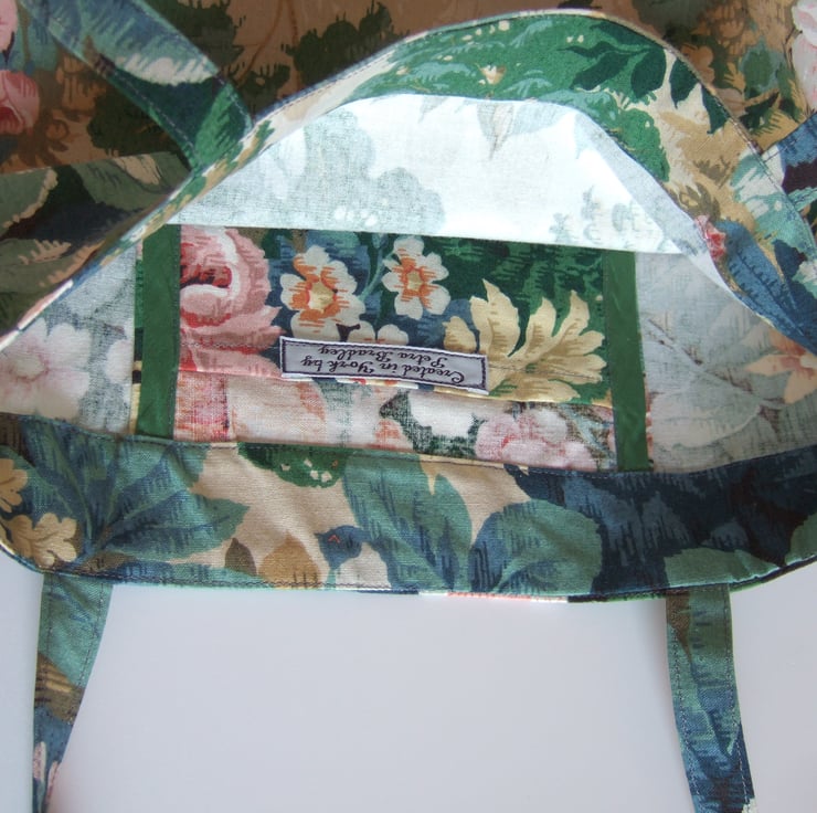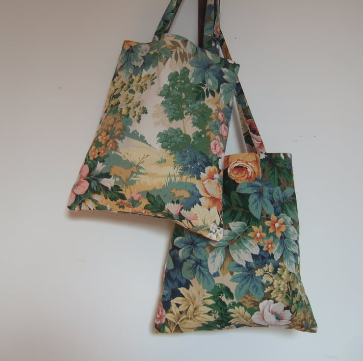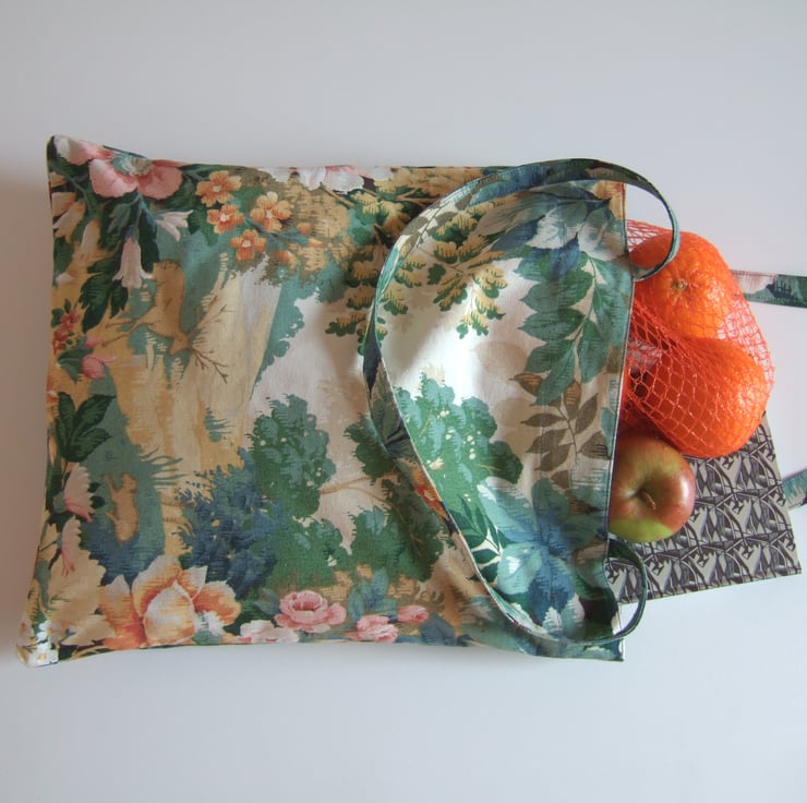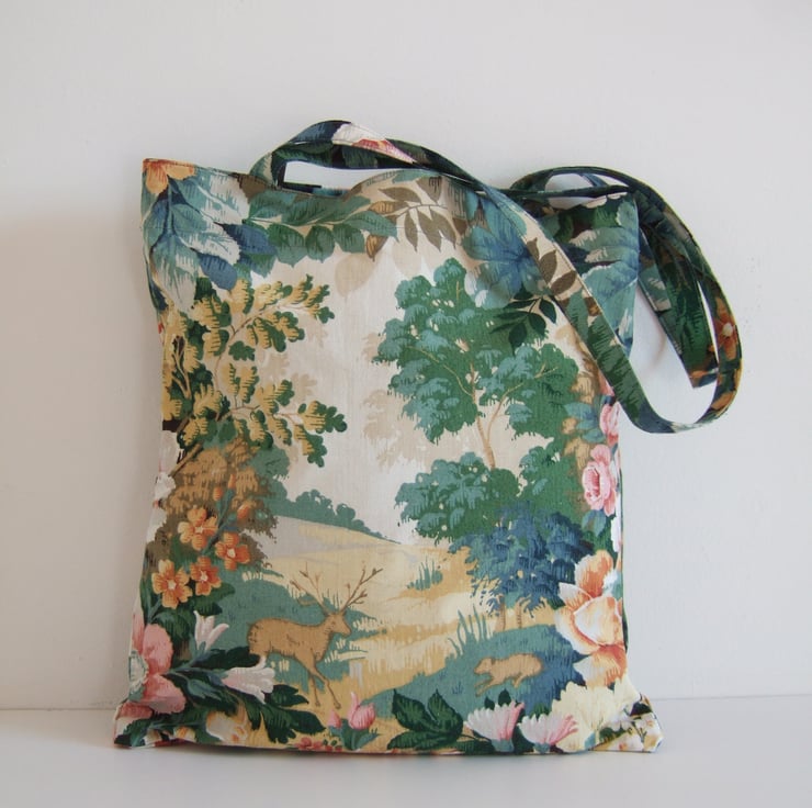 Peer into the magical Sanderson glen which adorns the front of this sturdy little bag. Made from a lovely piece of vintage furnishing fabric, it has a pretty woodland scene to the front, and a full blown floral motif to the back.