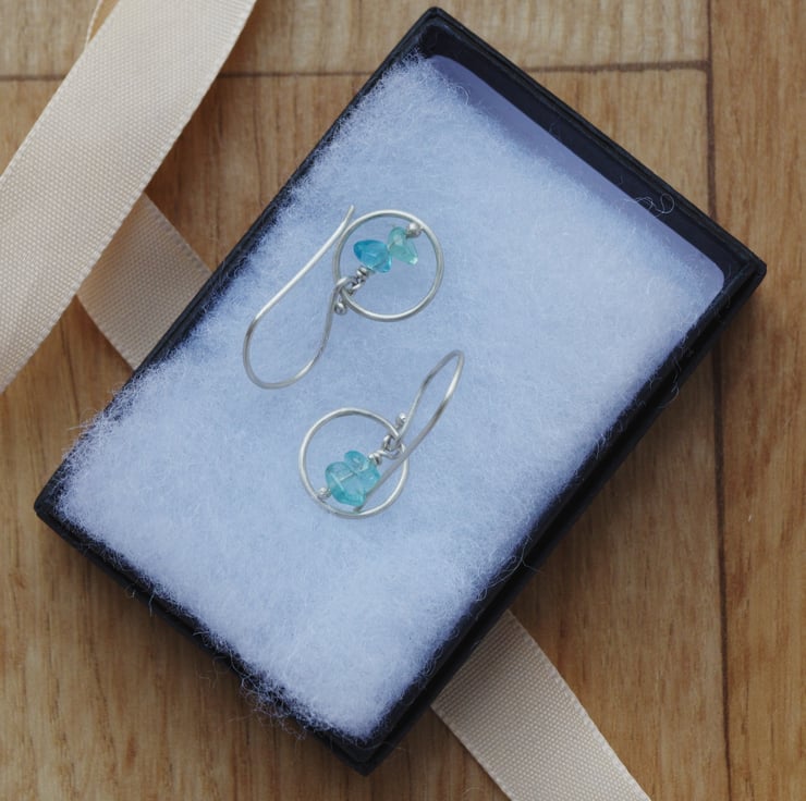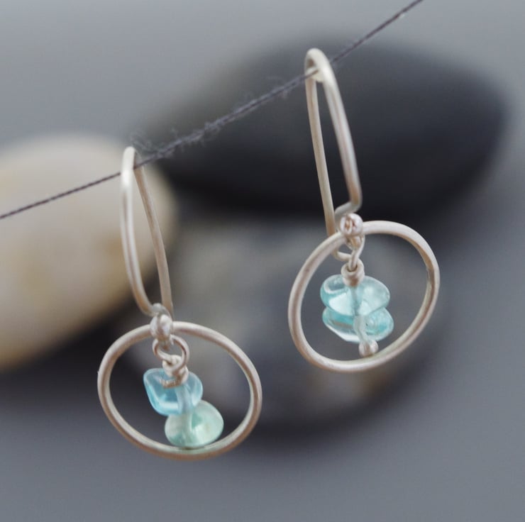 My elegant sterling silver hoop style karma earrings are designed with simplicity in mind. Each hoop is a perfect circle, symbolizing the principle of karma. Two irregular aqua coloured apatite crystals are suspended inside. All of the parts of these earrings have been handmade by me using sterling silver wire to which I have given a soft satin finish. Apatite is a semi-precious gemstone, which comes in translucent blues and greens and has a smooth, glassy sheen. Each measures just 28 mm or 1 and 1/16" long including the ear-wire and is so light and easy to wear.