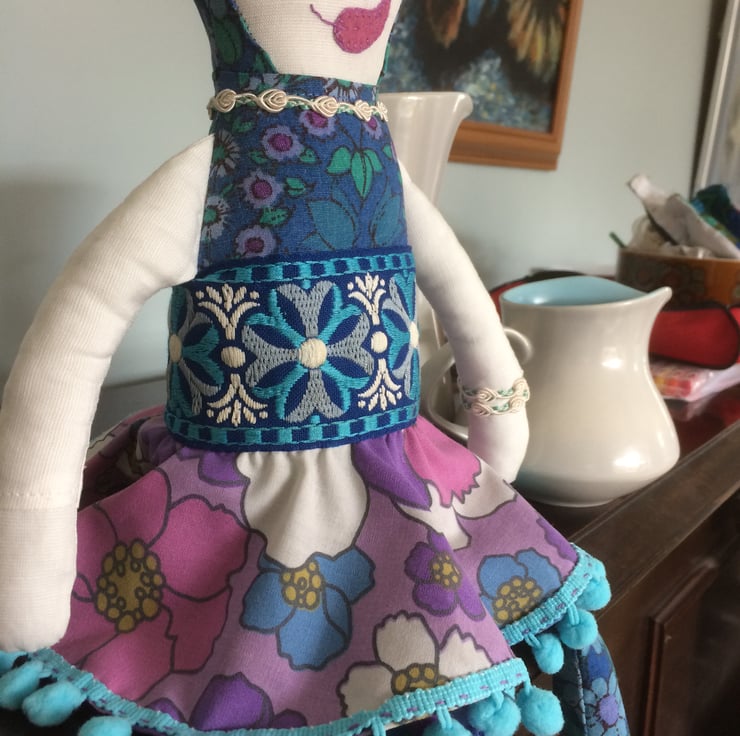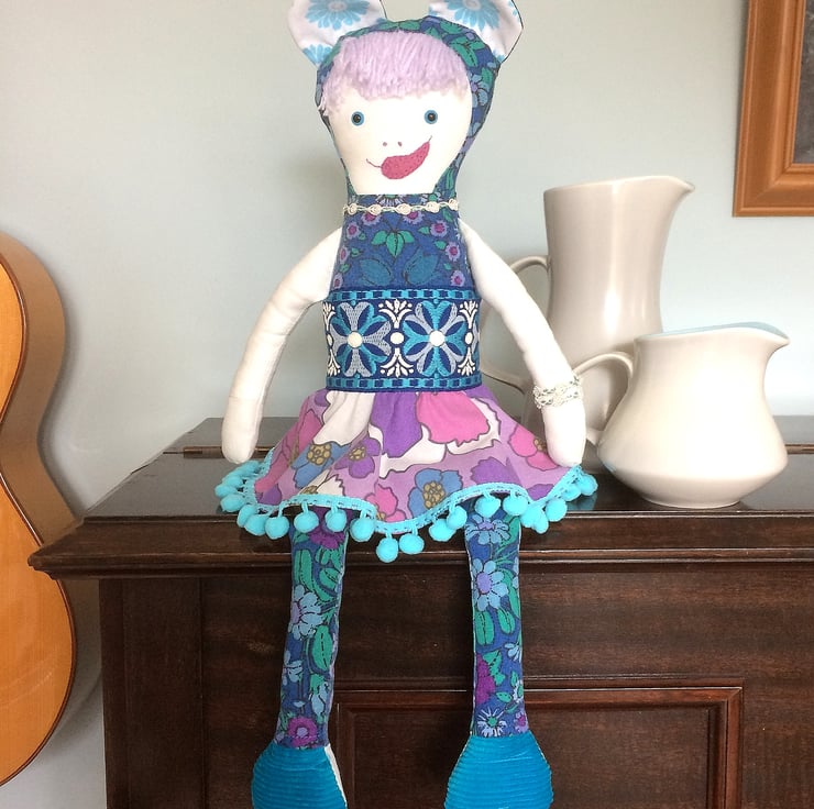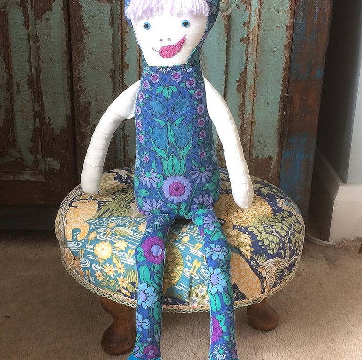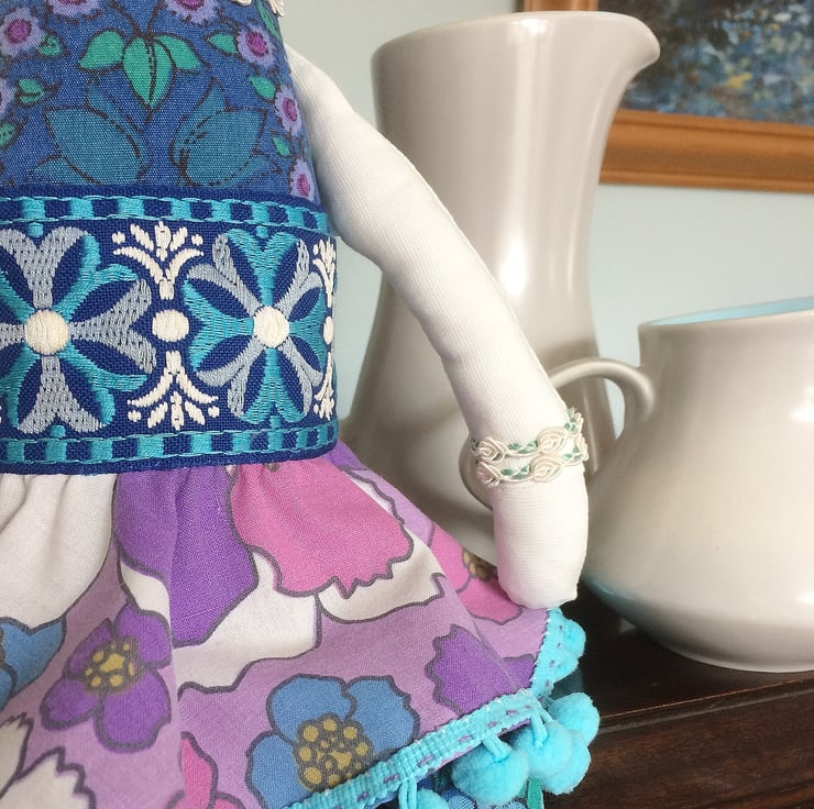 She is made from vintage fabric , with various trims and 100% polyester filling which conforms to BS1425, BS5852 and EN71 parts 1,2 & 3. She has small parts that although securely sewn could theoretically could pose a choking hazard - buttons, beads, plastic safety eyes and plastic weighting beads ( in a sachet inside to weight her so she sits up ) . NOT suitable for little ones so keep out of reach of small children and pets.