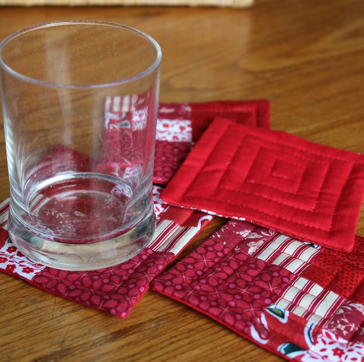 A set of four red coasters, each in a square design with a variety of different red fabrics. They measure 4 inches (10 cm) and have plain red backing. They are quilted in red thread, and have heat resistant wadding inside to protect your surfaces