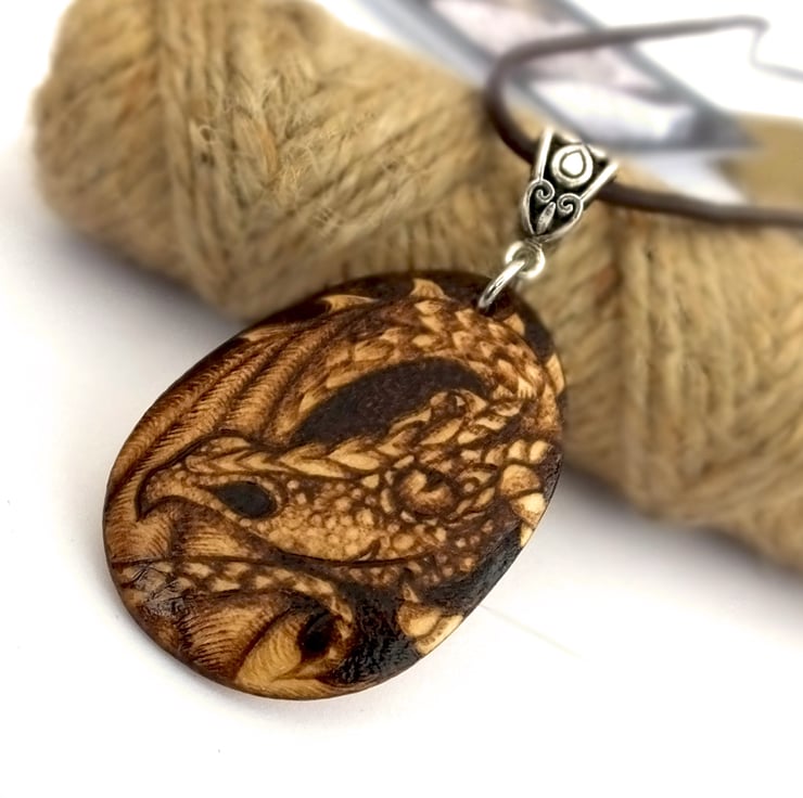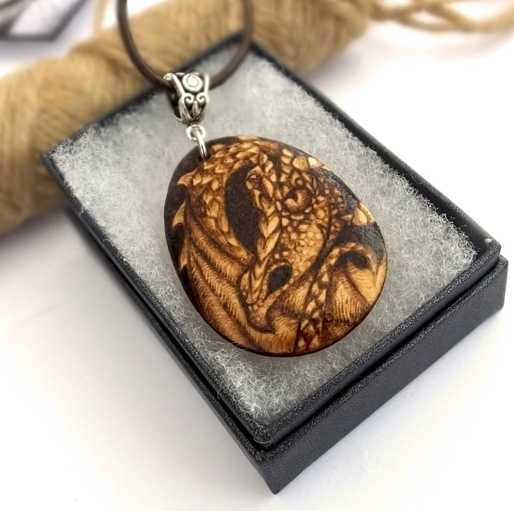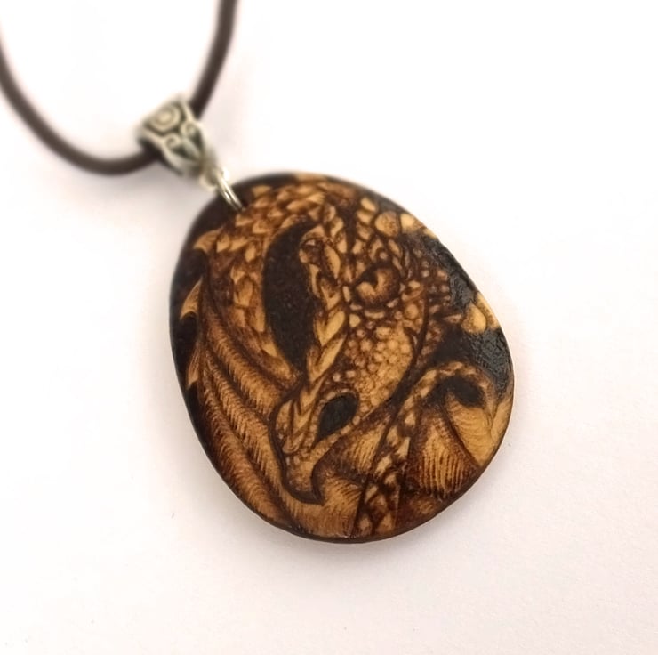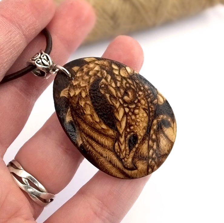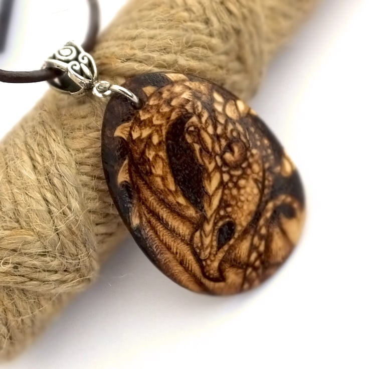 A gorgeous wooden pendant, with grinning dragon, curled looking at the viewer, ready to skulk back to his lair. Gorgeous necklace created using pyrography. Ideal for a birthday gift, or for a 5 year wood anniversary.