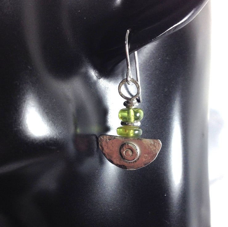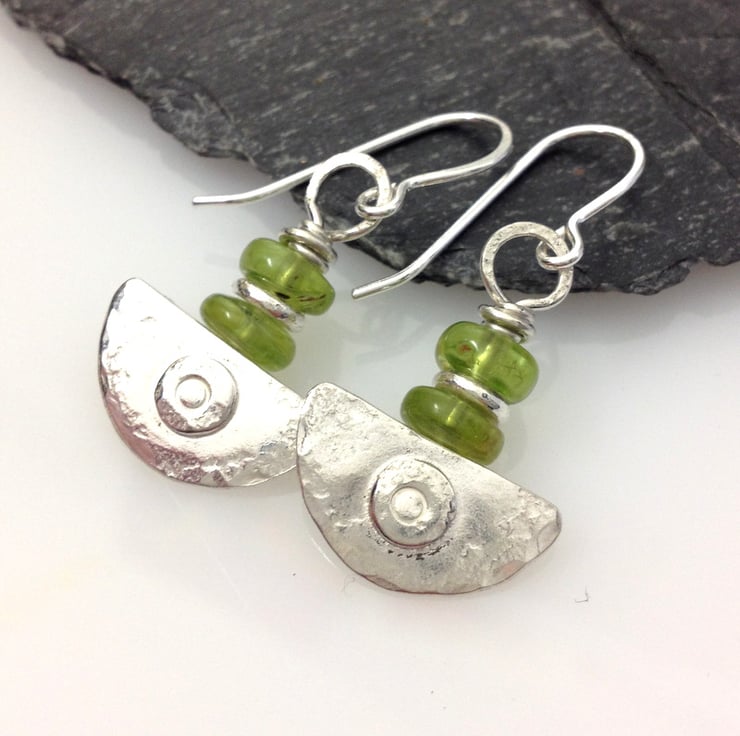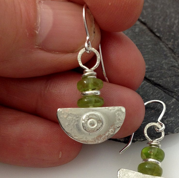 Sterling silver and peridot earrings. Fused and hammered for texture, then burnished to a subtle shine.
