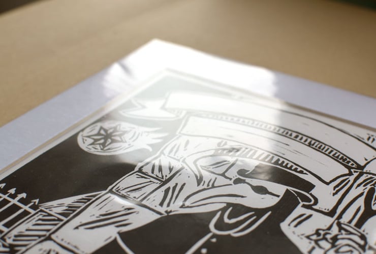 Water-based black, matte ink print on white 140 gsm paper, hand-hand pressed with a spoon and touched up by hand also to give it a consistent tone all over.