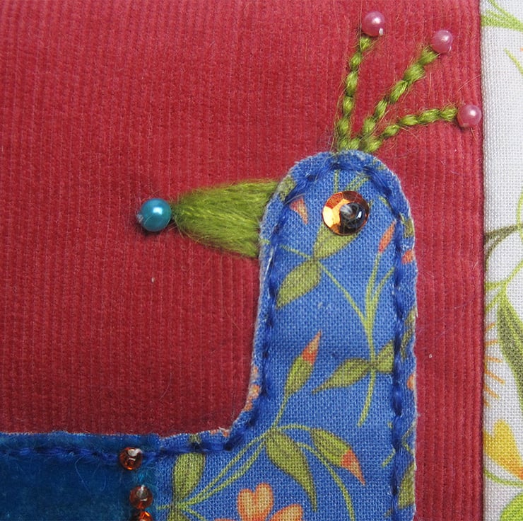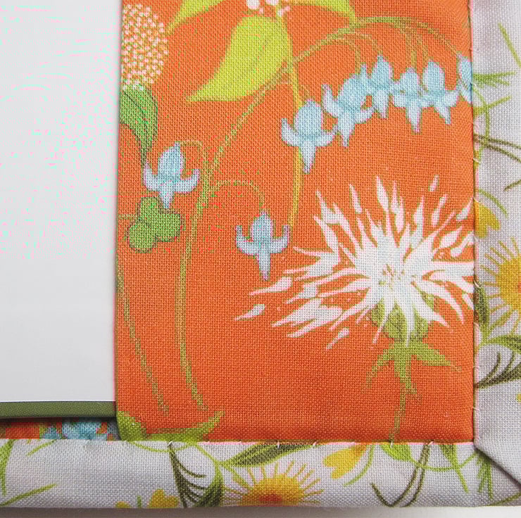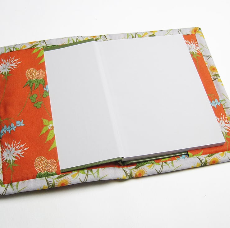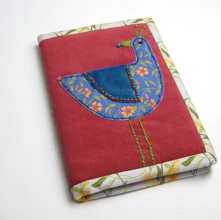 This A6 notebook cover is made in cherokee red cotton needlecord fabric and has a hand appliquéd bird on the front. The edge and the inside are trimmed with my own floral prints (dead nettle and marigold designs). The notebook tucks inside the jacket so you can replace the notebook once it is used up. The item comes supplied with a lined A6 notebook.