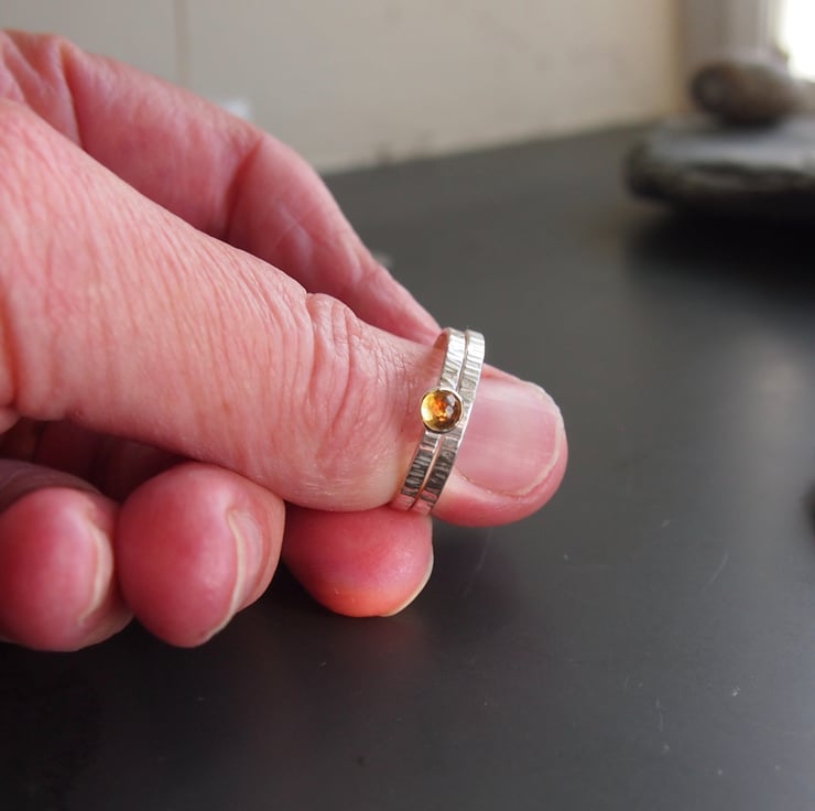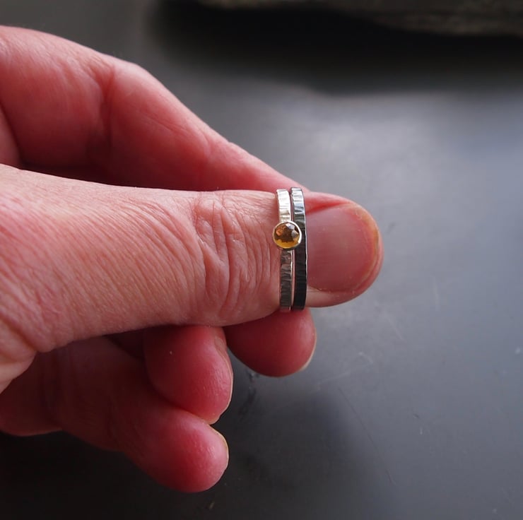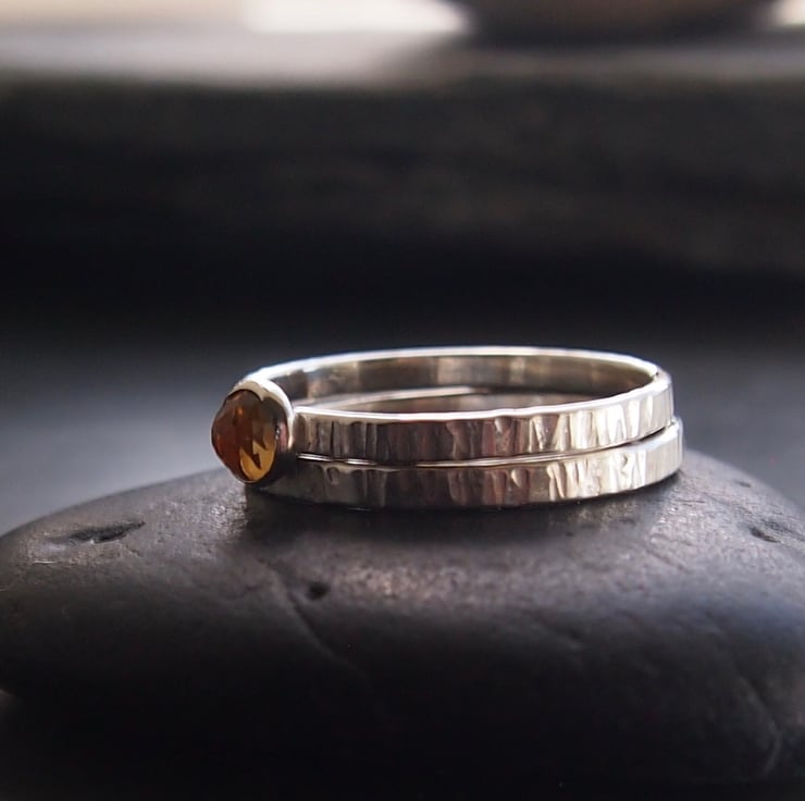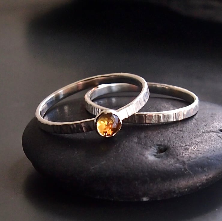 A sparkling honey coloured 4mm facetted citrine is mounted on a 2mm textured band and paired with a plain textured band.