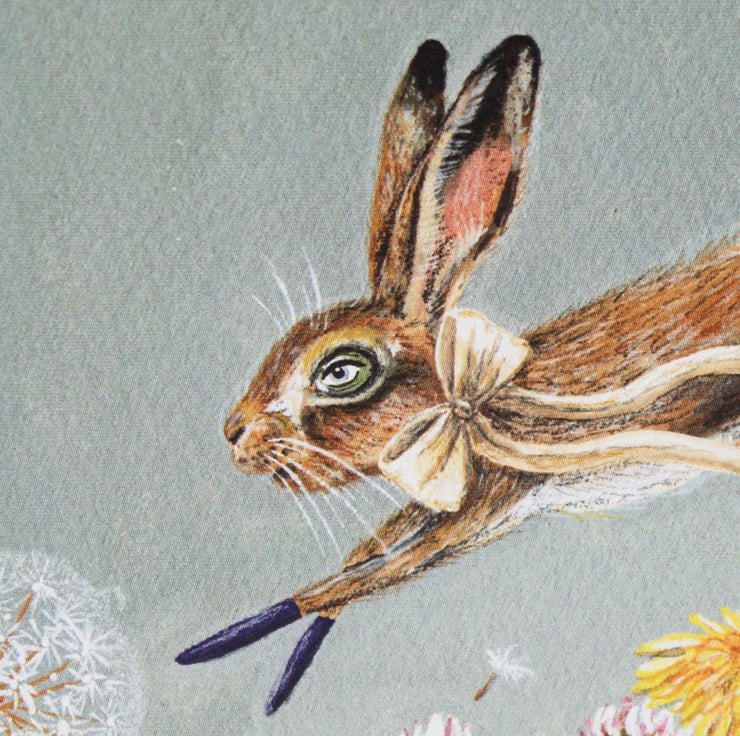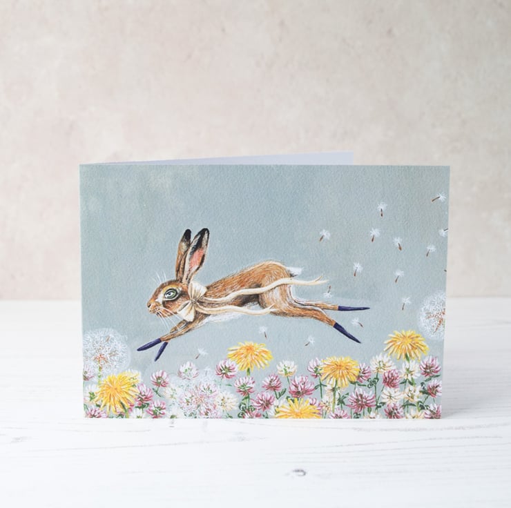 A beautiful greeting card featuring British wildlife at its finest. Here is Clover the march hare running through a field of dandelion and clover wild flowers.
