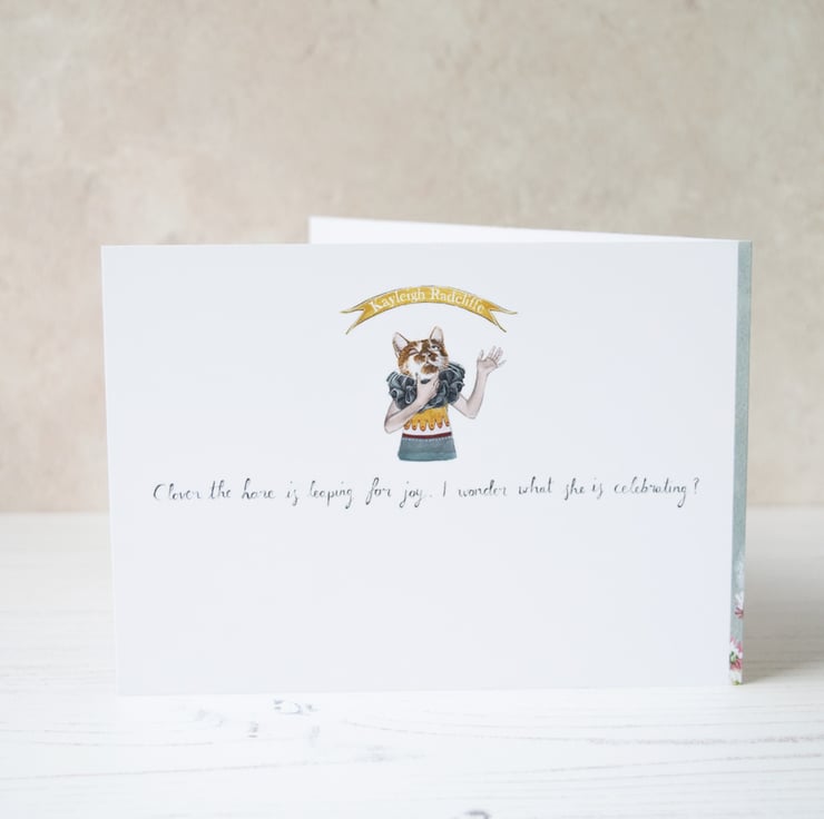 The back of the card features a little sentence about Clover. It says " Clover the hare is leaping for joy. I wonder what she is celebrating. "