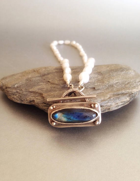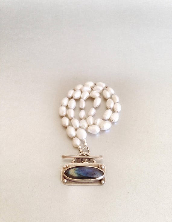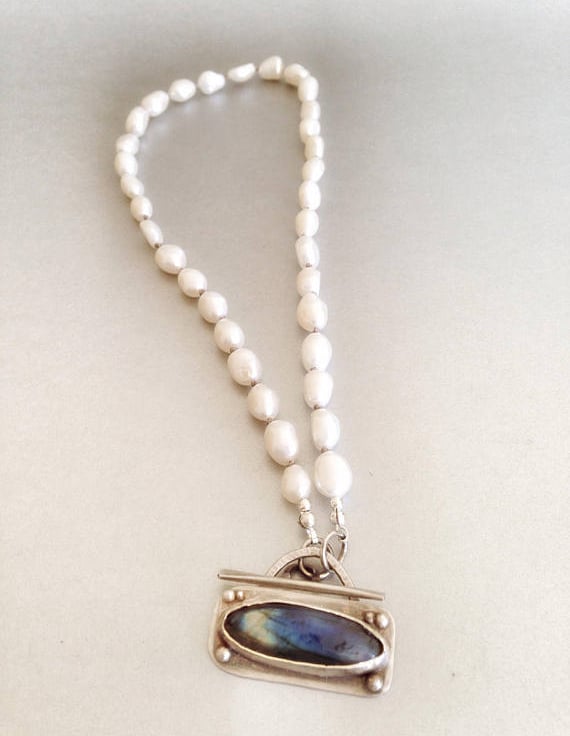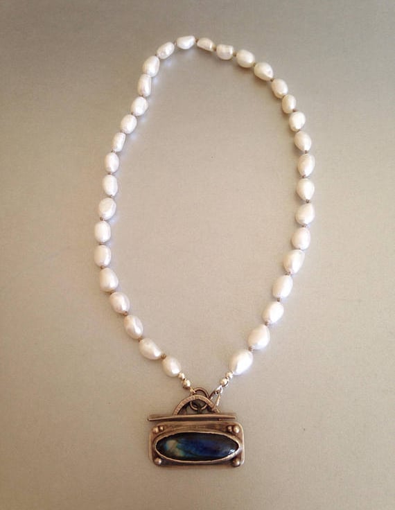 The clasp is handmade from sterling silver and holds a beautiful labradorite stone. The pearls are truly lovely freshwater pearls, about 8-9mm in size.