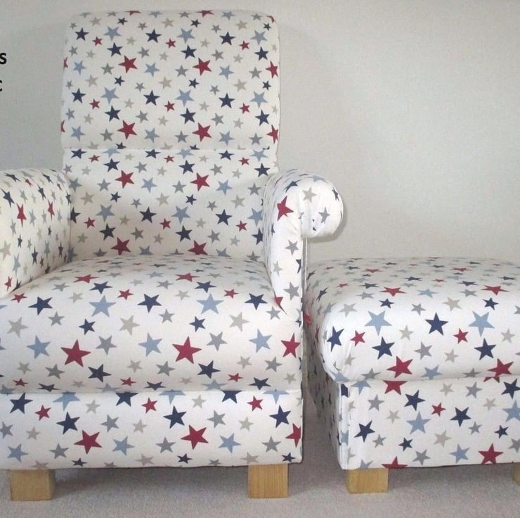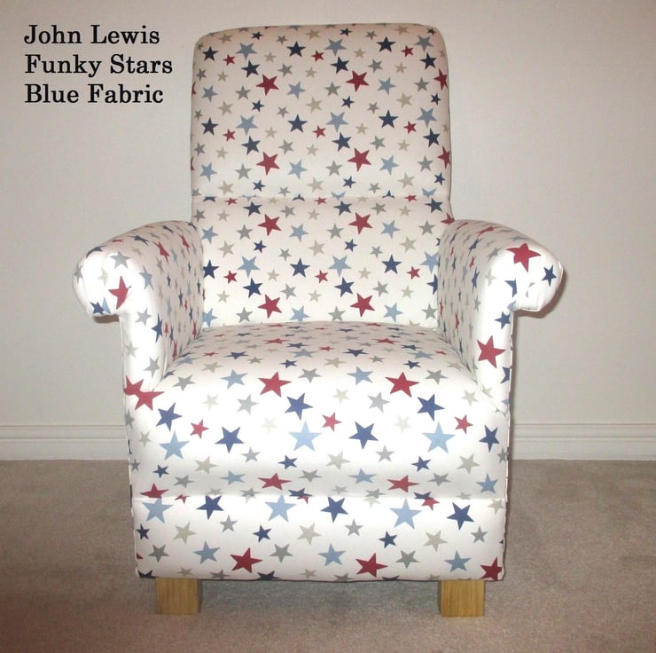 I am offering for sale this gorgeous ADULT'S chair, which has been made myself. I am a professional upholsterer with over 33 year’s experience, and have made this sturdy little chair and matching footstool, using John Lewis Funky Stars fabric in Blue.