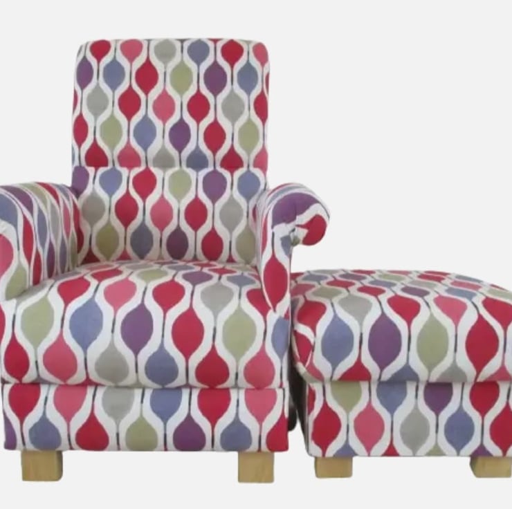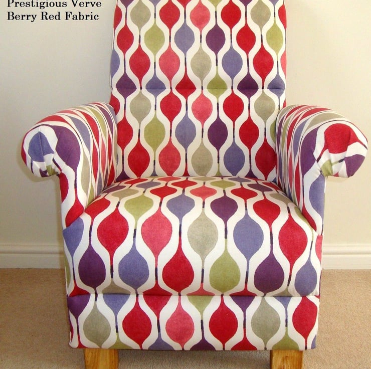 This lovely adult's armchair measures approximately 38 inches in height, by 26 inches wide and will look gorgeous in any room, and is a real accent piece of furniture. It has a wooden frame and has a fire retardant interliner, which makes it compliant with UK fire regulations. It is then upholstered entirely with this gorgeous fabric, and has solid wooden feet.