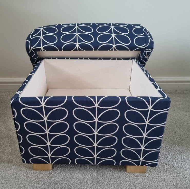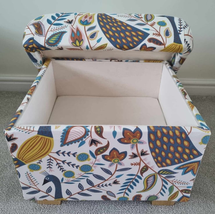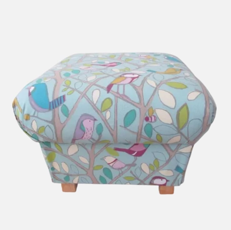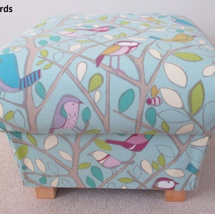 I am a professional upholsterer with over 33 years experience, and have handmade this storage footstool using Edinburgh Weavers Tweety Birds Duck Egg fabric.
