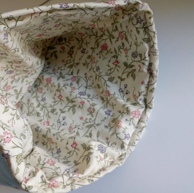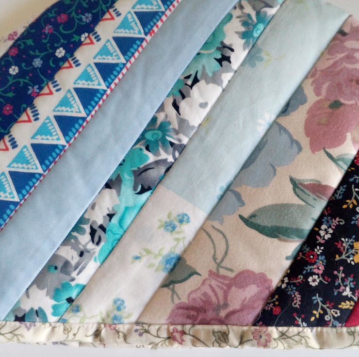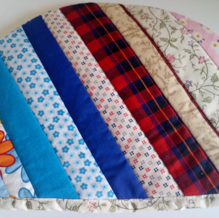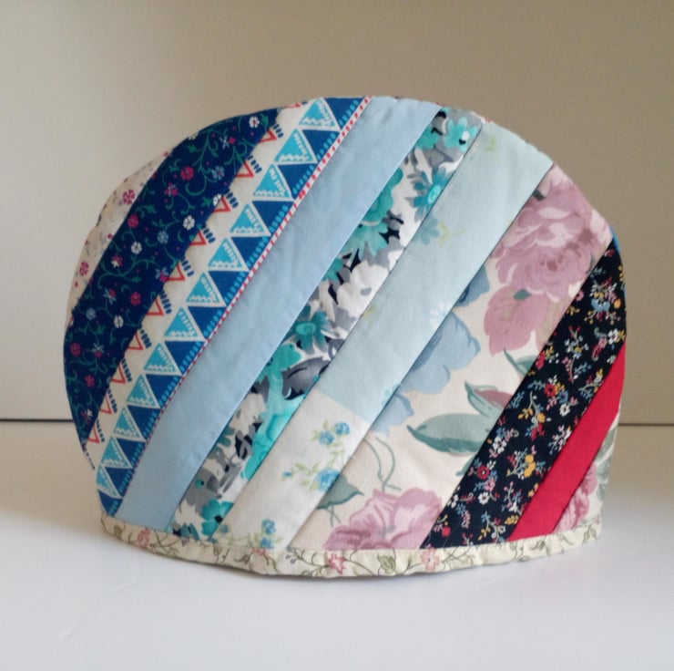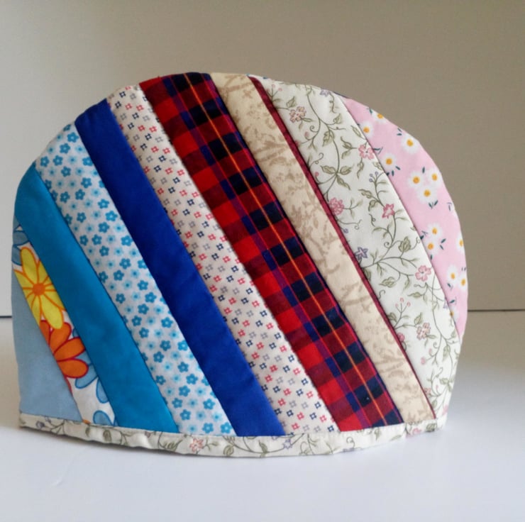 A stripey patchwork quilted tea cosy. When flat measures 32cm across the bottom and 23 cm high. It is lined in a floral cotton fabric. It will fit a four to six cup teapot.