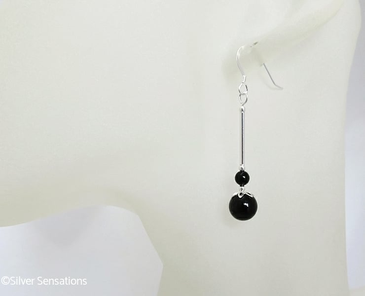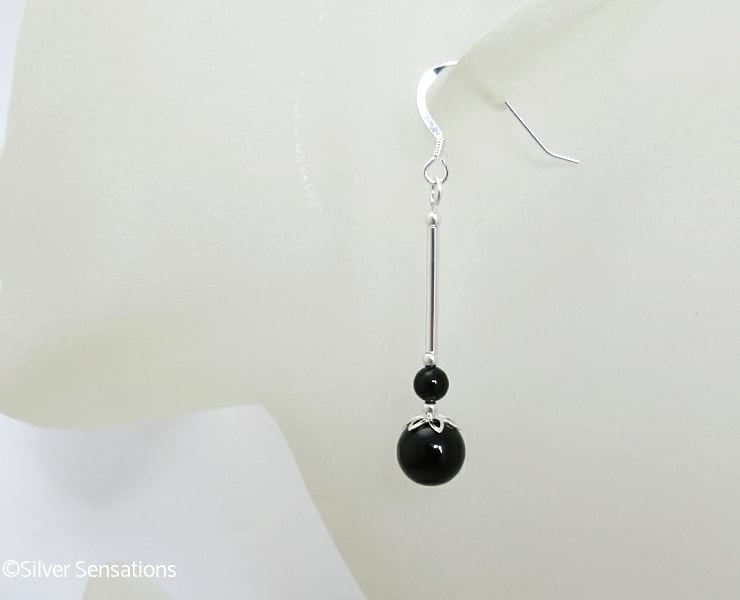 Elegant Jet Black Onyx Beaded Earrings With Sterling Silver Tubes