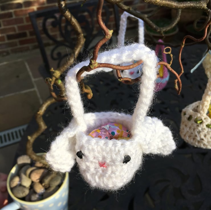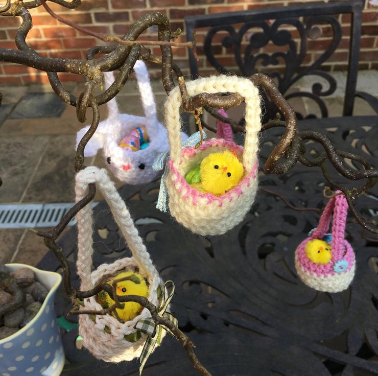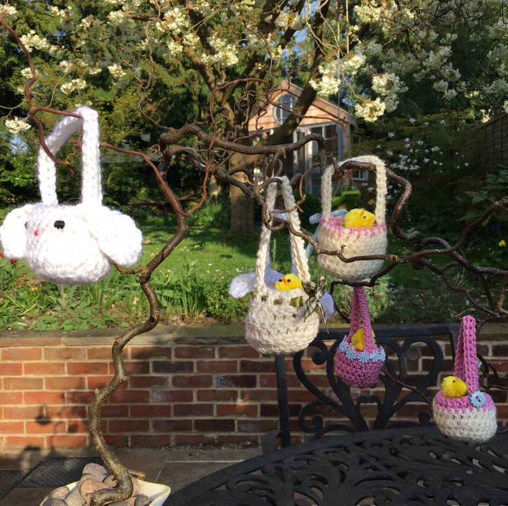 Grab a bargain - I've got just a few of these crochet Easter baskets left after a craft fair. Perfect for a little egg hunt, each can hold 7 or 8 small foil wrapped eggs. Colours may vary but you will receive 2 bunnies and 4 baskets with ribbon, lace or button decoration.