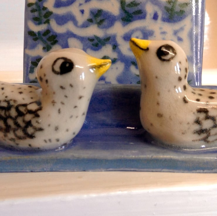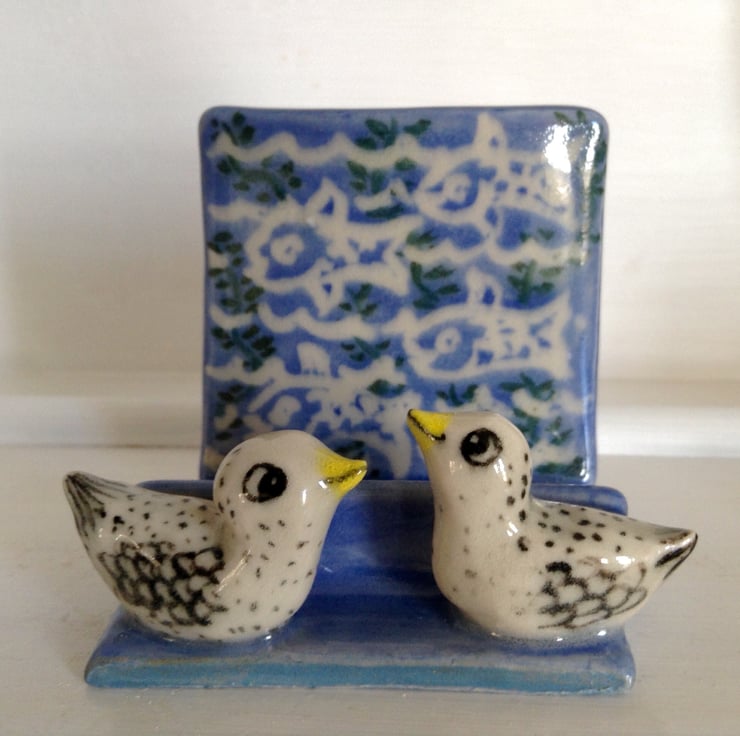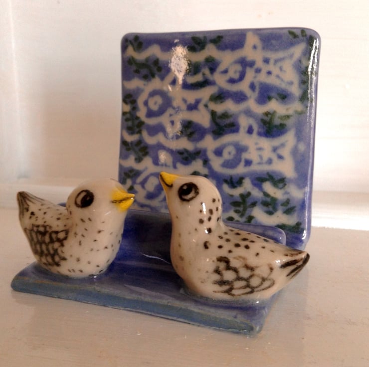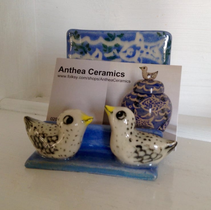 Really charming handmade ceramic business card holder with two little sculpted birds at the front. The holder is decorated with a fish design in blue, white and green on the back support and will hold plenty of cards. It measures 6 cms deep, 7.5 cms high and 7.5 cms wide.