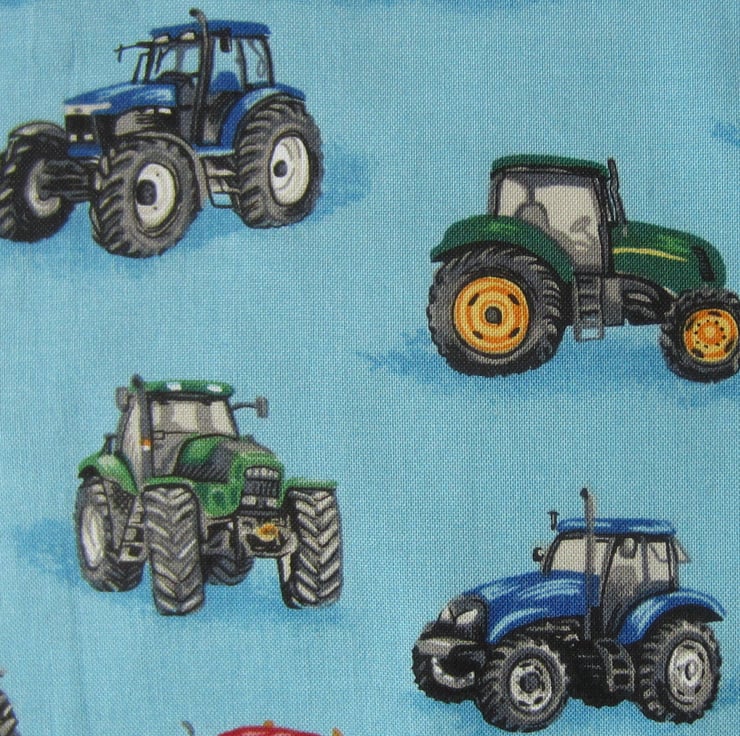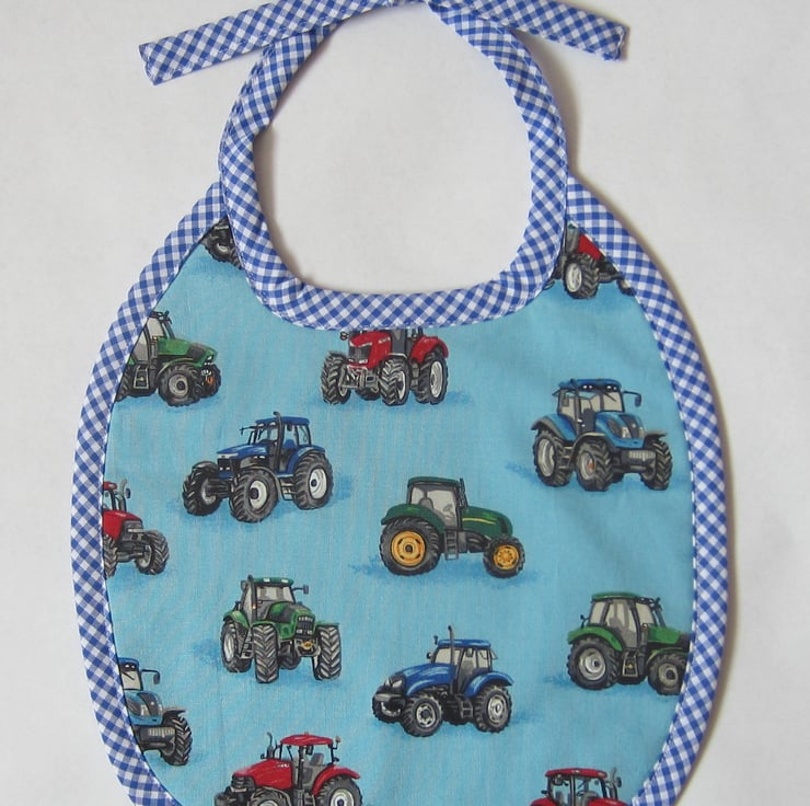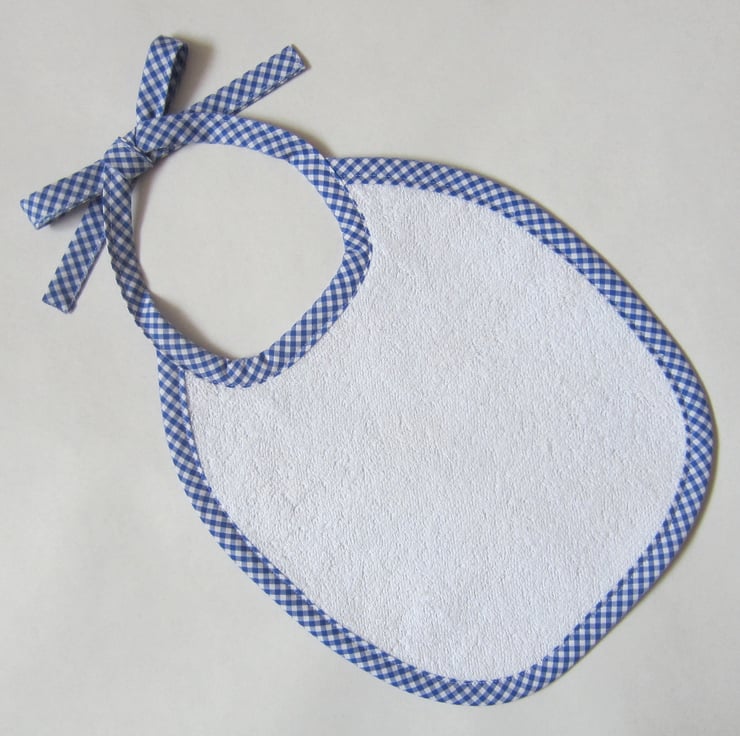 Blue tractor bib backed with white towelling and edged in blue and white gingham.