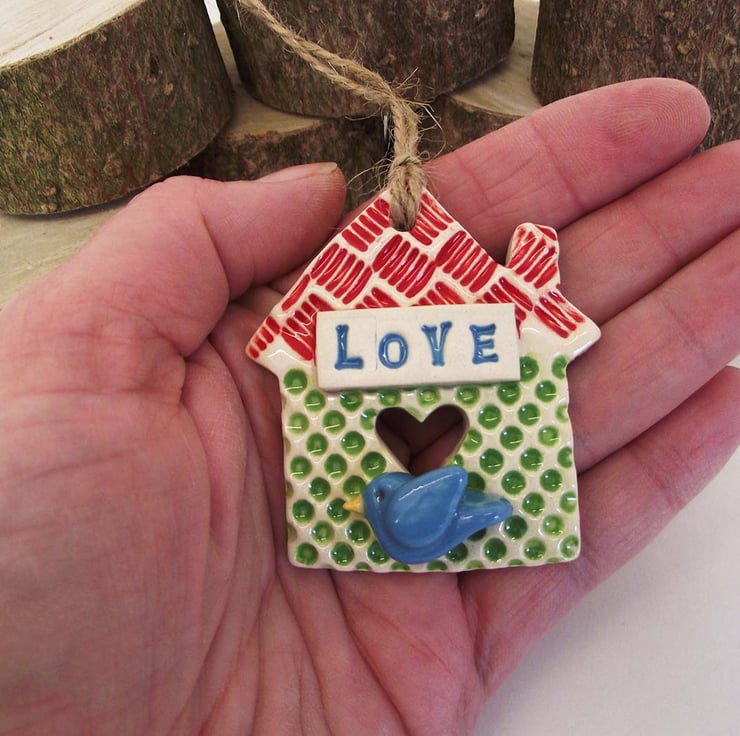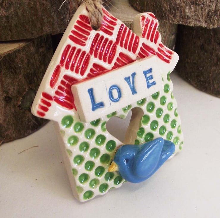 This little house decoration is made from white earthenware clay and finished in a variety of patterns and colours.