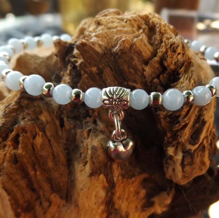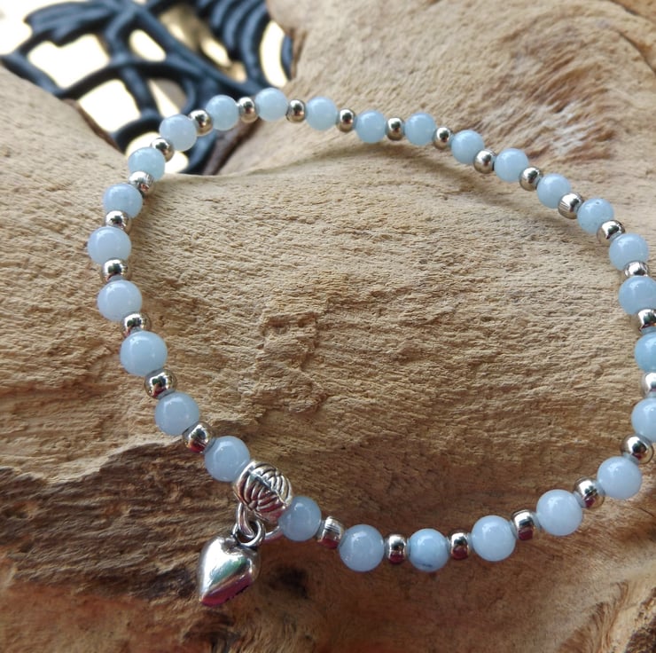 Aquamarine 4mm beads with silver plated heart charm and silver plated brass spacer beads will fit wrist upto 7.5" and will come gift packaged